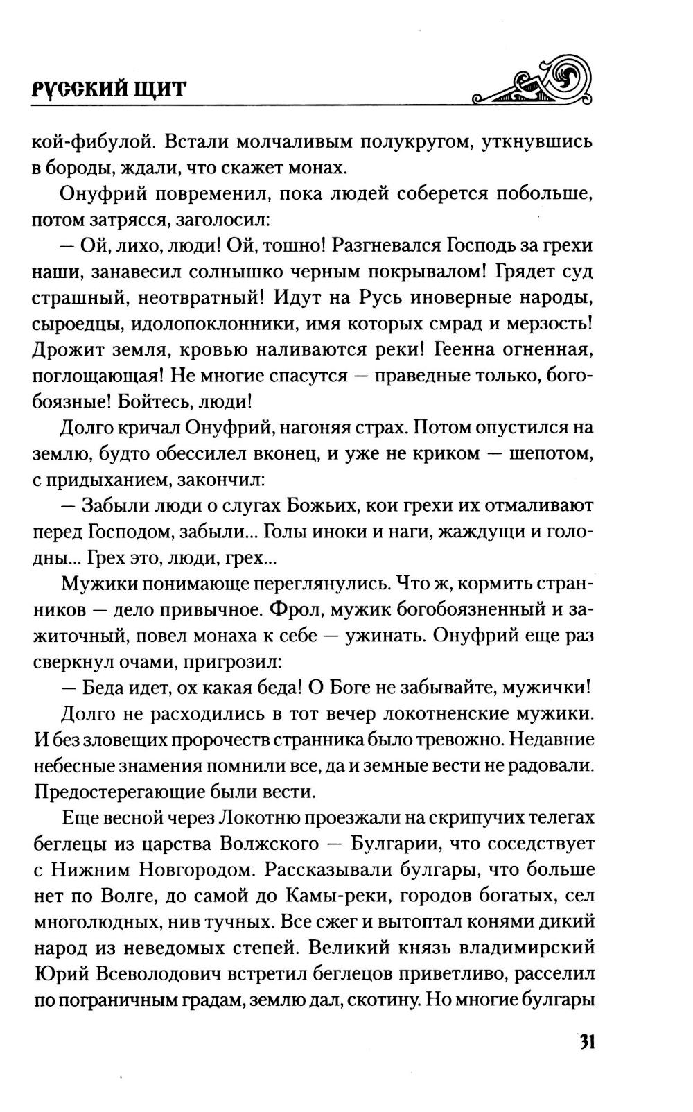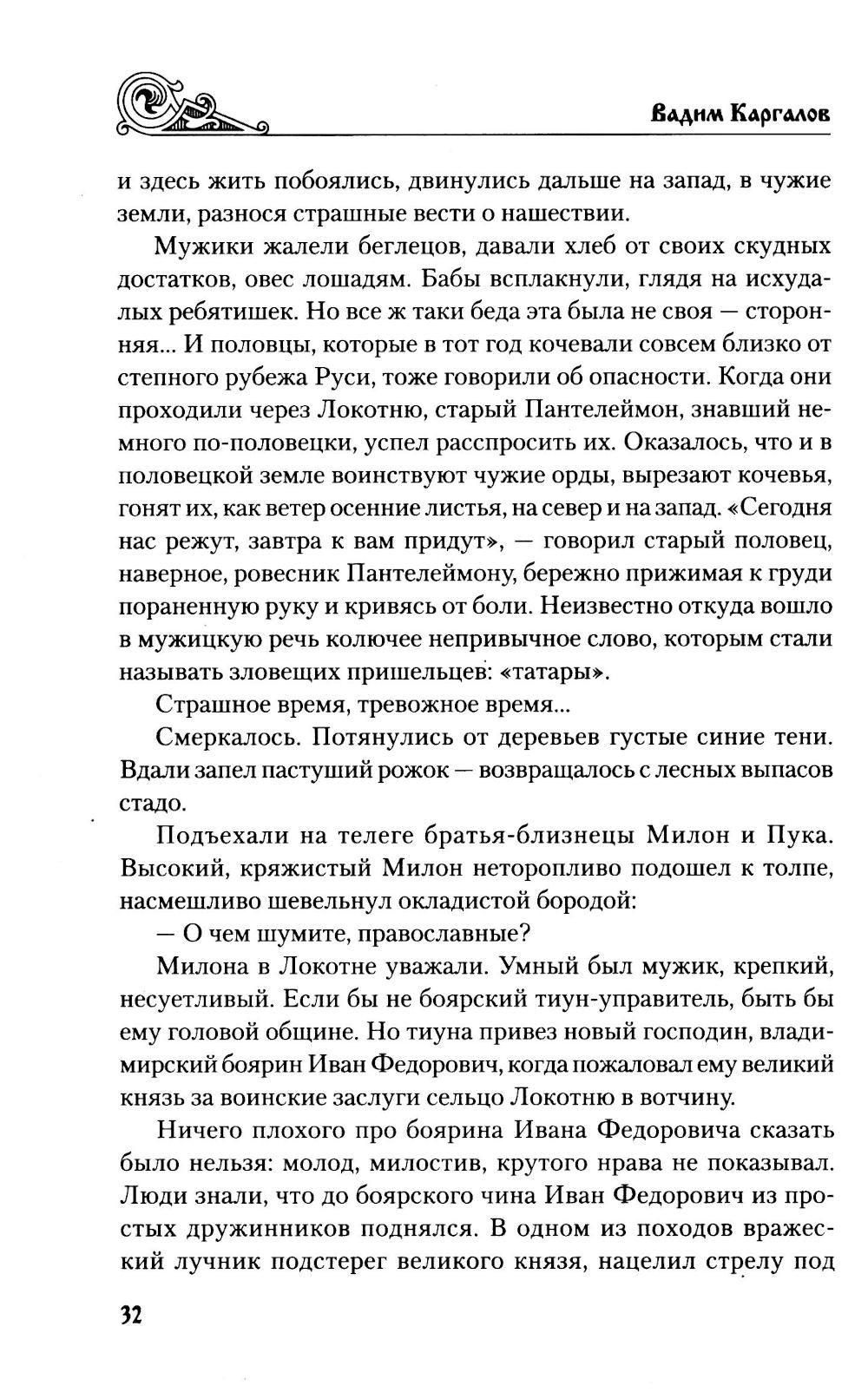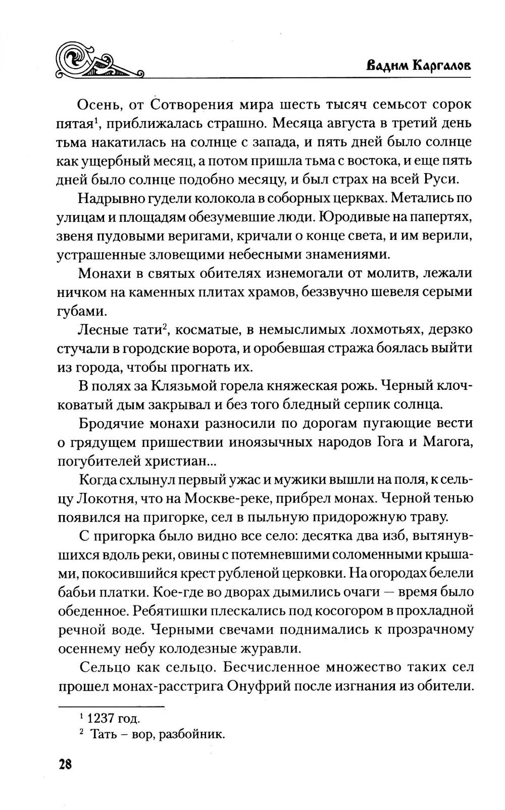 ХIII век. По всей Европе тревожно гудят колокола - это собираются в рати знатные рыцари и простолюдины христианского мира, чтобы защитить свои домашние очаги и прогнать незваных пришельцев с Востока. Между Европой и азиатскими завоевателями оставался только один щит - русский! Но надолго ли кривые монгольские сабли увязнут в дремучих русских лесах? Действие романа-хроники Вадима Викторовича Каргалова относится к одному из самых трагических периодов отечественной истории, когда конные тумены Золотой Орды обрушились на разрозненные, раздираемые междоусобной враждой русские княжества.