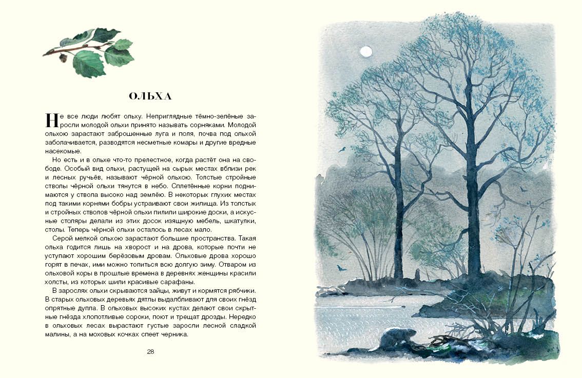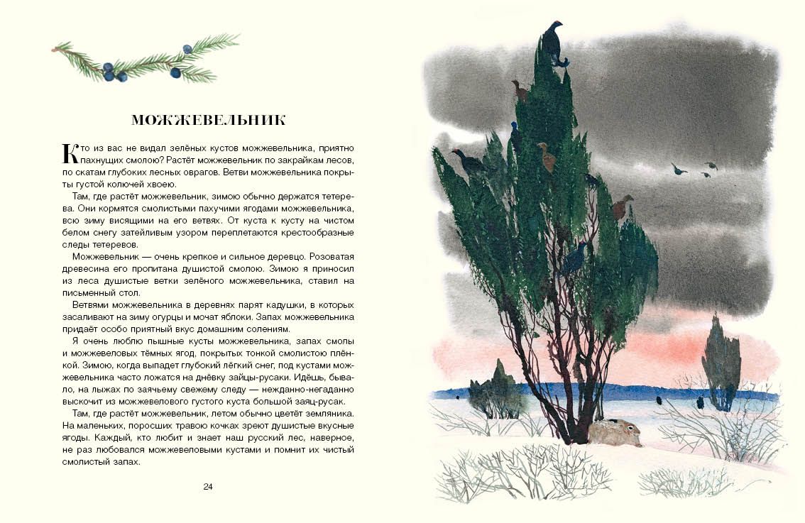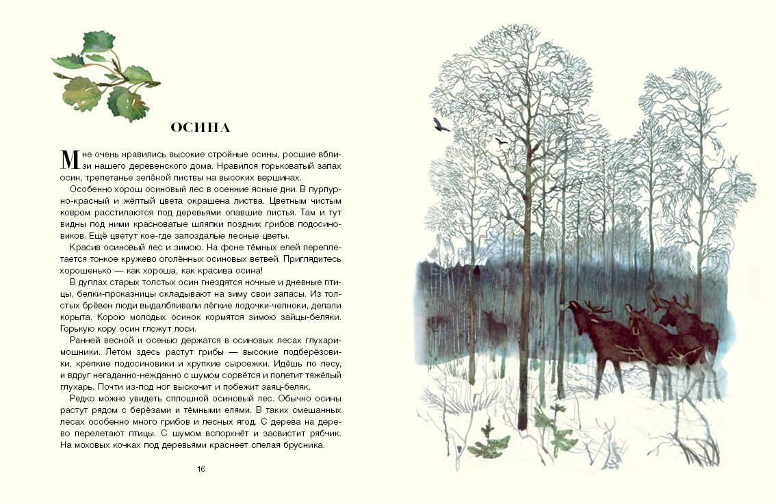 Каждое время года приносит в русский лес свою особенную, неповторимую красоту. Осенью и зимой, весной и летом идёт здесь своя жизнь: вот под можжевеловым кустом притаился заяц-русак, с одной ели на другую перепрыгивают торопливые белки, а над цветущими липами гудят пчёлы. Рассказы Ивана Соколова-Микитова с блестящими иллюстрациями Георгия Никольского перенесут маленьких читателей на лесные опушки, проведут по укромным тропам, выведут к берегу ручья и расскажут о самых разных деревьях, которые растут в наших лесах.