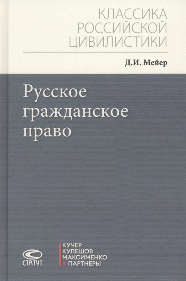 Дмитрий Иванович Мейер - первопроходец российской цивилистики. В курсе лекций, прочитанных в Казанском университете в середине XIX в., которые подготовили к изданию после безвременной кончины профессора его ученики и последователи, он дает первую в истории правоведения России стройную систему предмета и задач гражданского права. Помимо текста «Русского гражданского права» в книгу включены предисловия А.Х. Гольмстена к 6-му (1894 г.), 8-му (1902 г.) изданиям и биографии Д.И. Мейера и А.И. Вицына, написанные также А.Х. Гольмстеном. Все тексты воспроизводятся по 8-му, исправленному и дополненному изданию 1902 г.