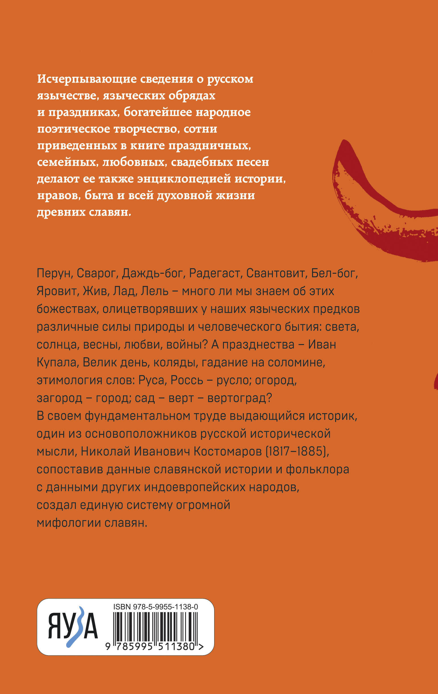 Перун, Сварог, Даждь-бог, Радегаст, Свантовит, Бел-бог, Яровит, Жив, Лад, Лель - много ли мы знаем об этих божествах, олицетворявших у наших языческих предков различные силы природы и человеческого бытия: света, солнца, весны, любви, войны? А празднества - Иван Купала, Велик день, Коляды, гадание на соломине, этимология слов: Руса, Россь - русло; огород, загород - город; сад - верт - вертоград? В своем фундаментальном труде выдающийся историк, один из основоположников русской исторической мысли Николай Иванович Костомаров (1817-1885), сопоставив данные славянской истории и фольклора с данными других индоевропейских народов, создал единую систему огромной мифологии славян. Исчерпывающие сведения о русском язычестве, языческих обрядах и праздниках, богатейшее народное поэтическое творчество, сотни приведенных в книге праздничных, семейных, любовных, свадебных песен делают ее также энциклопедией истории, нравов, быта и всей духовной жизни древних славян.