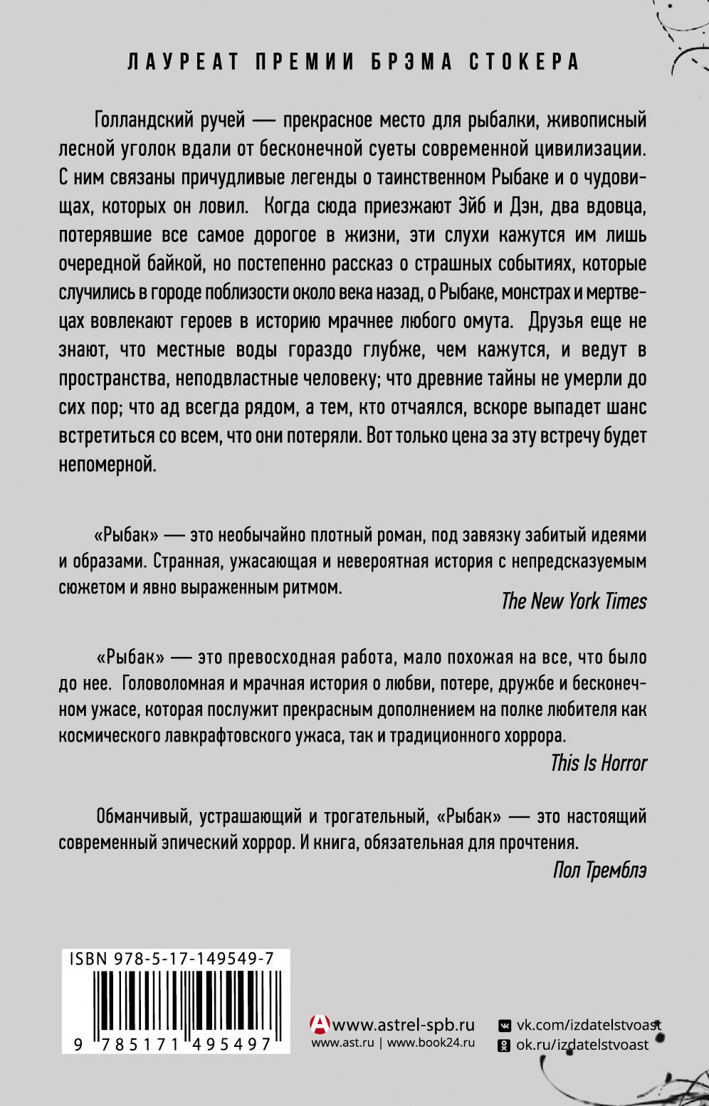 Для всех поклонников Стивена Кинга и Клайва Баркера. Мрачный, устрашающий и завлекательный хоррор с элементами психологического триллера. Номинант премии «Локус». Джон Лэнган - это один из наиболее известных современных редакторов и авторов, работающих в жанре хоррора, автор романа «Дом окон». Голландский ручей - прекрасное место для рыбалки, живописный лесной уголок вдали от бесконечной суеты современной цивилизации. С ним связаны причудливые легенды о таинственном Рыбаке и о чудовищах, которых он ловил. Когда сюда приезжают Эйб и Дэн, два вдовца, потерявшие все самое дорогое в жизни, эти слухи кажутся им лишь очередной байкой, но постепенно рассказ о страшных событиях, произошедших в городе поблизости около века назад, о Рыбаке, монстрах и мертвецах вовлекают героев в историю мрачнее любого омута. Друзья еще не знают, что местные воды гораздо глубже, чем кажутся, и ведут в пространства, неподвластные человеку; что древние тайны не умерли до сих пор; что ад всегда рядом, а тем, кто отчаялся, вскоре выпадет шанс встретиться со всем, что они потеряли. Вот только цена за эту встречу будет непомерной.| Издательство | АСТ |