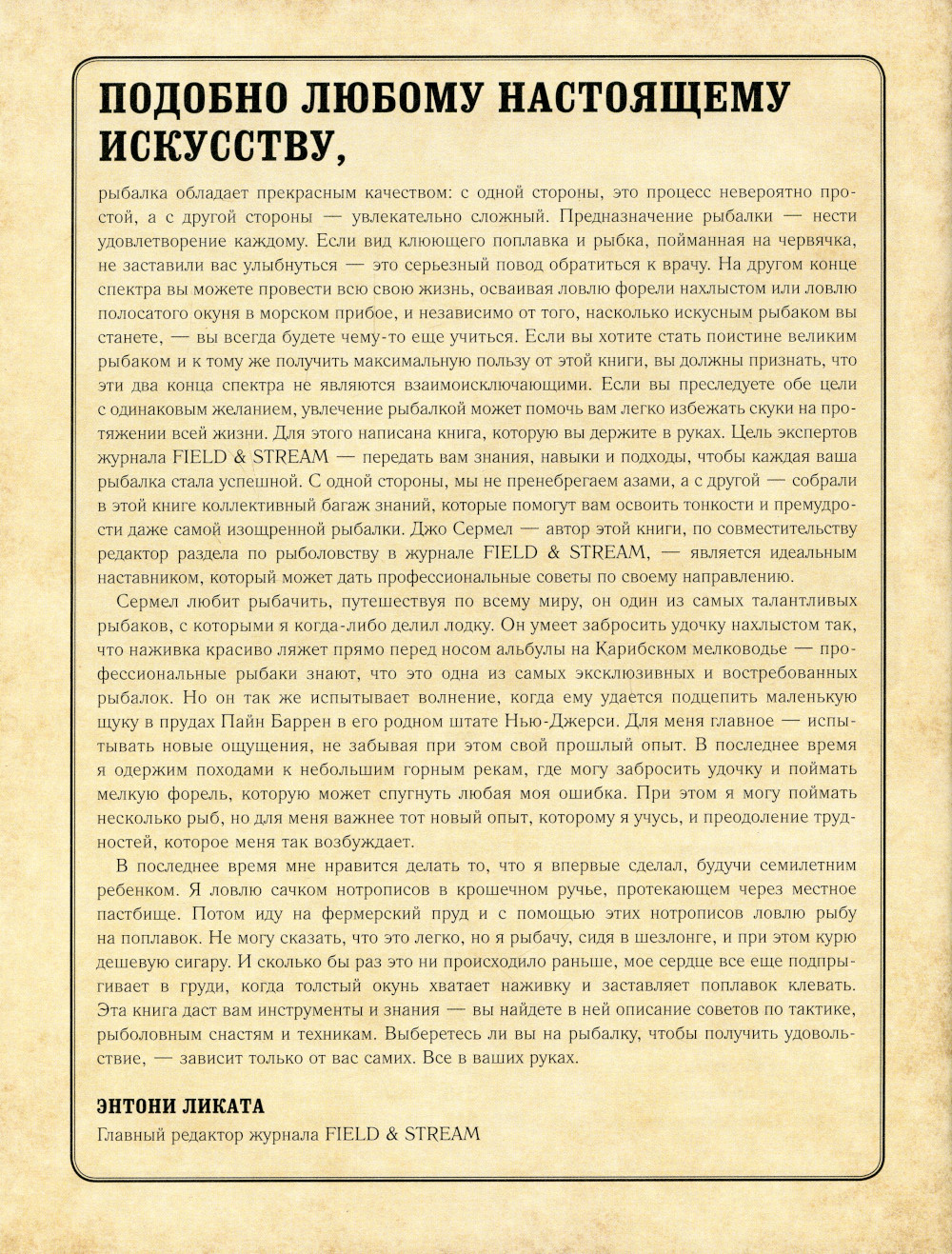 Когда дело доходит до рыбной ловли, никто не знает больше, чем авторы и редакторы известного журнала Field & Stream. В этой книге они поделились многолетним опытом и знаниями, собрав 317 основных рыболовных навыков на каждый случай. «Большая энциклопедия» станет надежным путеводителем в мире рыбалки, где вы найдете подробно проиллюстрированную информацию, инструкции и наблюдения лучших рыболовов, чей многолетний опыт, результаты и награды на всевозможных турнирах не позволят усомниться в их правоте. Энциклопедия содержит актуальные и полезные советы о каждом аспекте рыбалки, которые пригодятся как новичкам, так и уже опытным рыболовам. Вы узнаете обо всех основных техниках и тактиках, приманках и необходимых инструментах, освоите тонкости и премудрости даже самой изощренной рыбалки. Все эти советы помогут вам приятно провести время и поймать прекрасный трофей.| Издательство | АСТ |