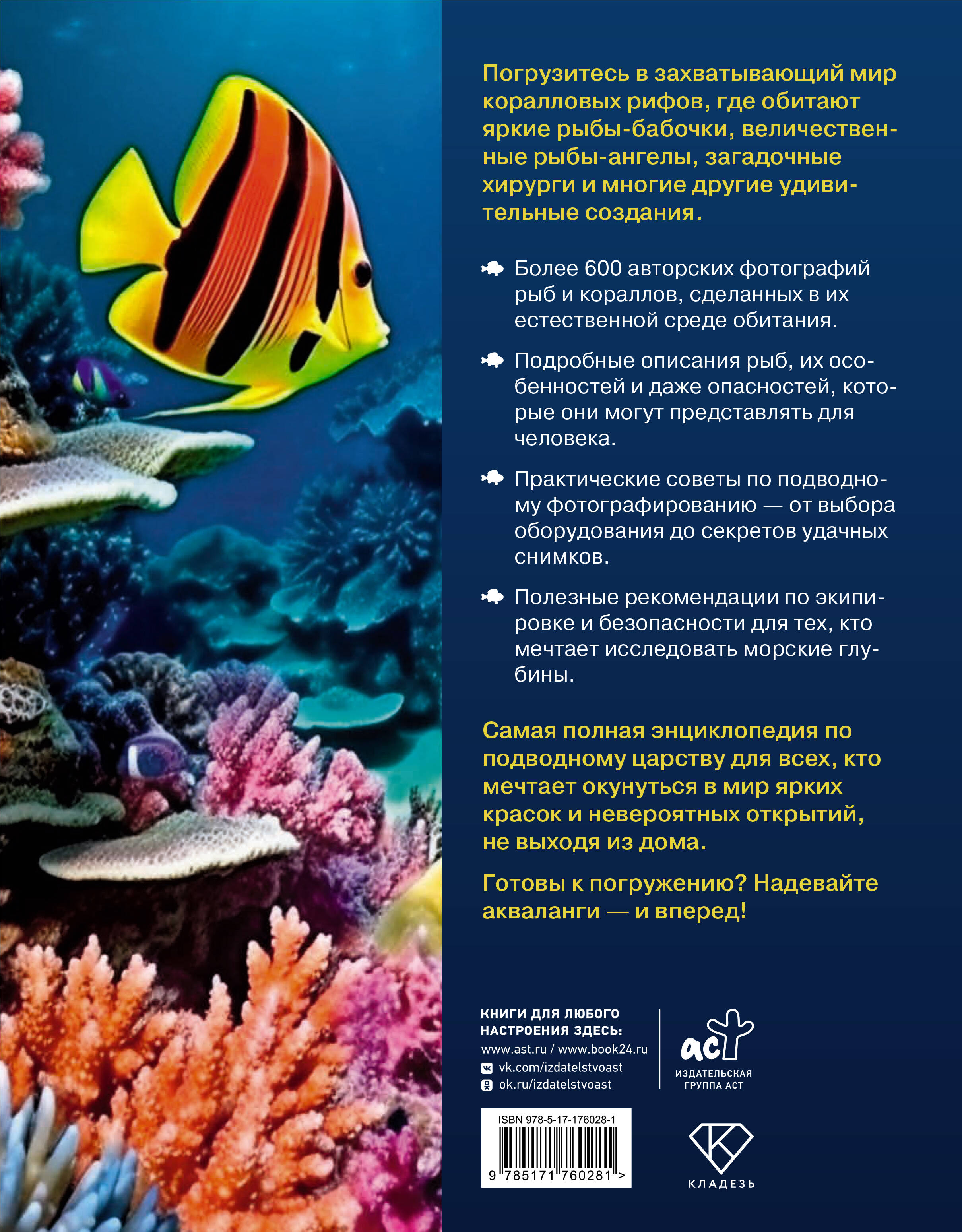 Погрузитесь в захватывающий мир коралловых рифов, где обитают яркие рыбы-бабочки, величественные рыбы-ангелы, загадочные хирурги и многие другие удивительные создания. • Более 600 авторских фотографий рыб и кораллов, сделанных в их естественной среде обитания. • Подробные описания рыб, их особенностей и даже опасностей, которые они могут представлять для человека. • Практические советы по подводному фотографированию - от выбора оборудования до секретов удачных снимков. • Полезные рекомендации по экипировке и безопасности для тех, кто мечтает исследовать морские глубины. Самая полная энциклопедия по подводному царству для всех, кто мечтает окунуться в мир ярких красок и невероятных открытий, не выходя из дома. Готовы к погружению? Надевайте акваланги ― и вперед!| Издательство | Издательство "АСТ" |