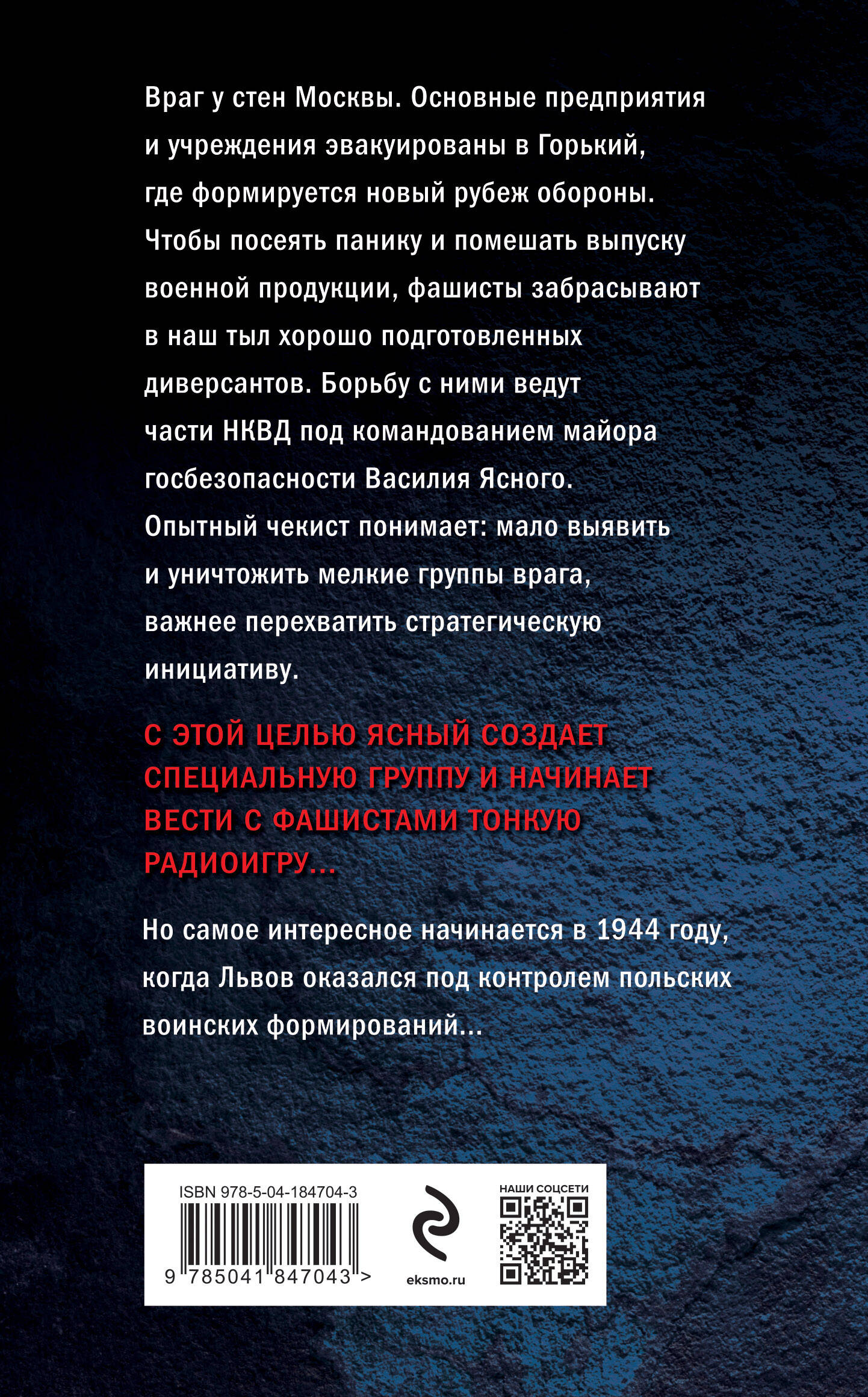 Враг у стен Москвы. Основные предприятия и учреждения эвакуированы в Горький, где формируется новый рубеж обороны. Чтобы посеять панику и помешать выпуску военной продукции, фашисты забрасывают в наш тыл хорошо подготовленных диверсантов. Борьбу с ними ведут части НКВД под командованием майора госбезопасности Василия Ясного. Опытный чекист понимает: мало выявить и уничтожить мелкие группы врага, важнее перехватить стратегическую инициативу. С этой целью Ясный создает специальную группу и начинает вести с фашистами тонкую радиоигру… Но самое интересное начинается в 1944 году, когда Львов оказался под контролем польских воинских формирований...| Издательство | ООО "Издательство "Эксмо" |