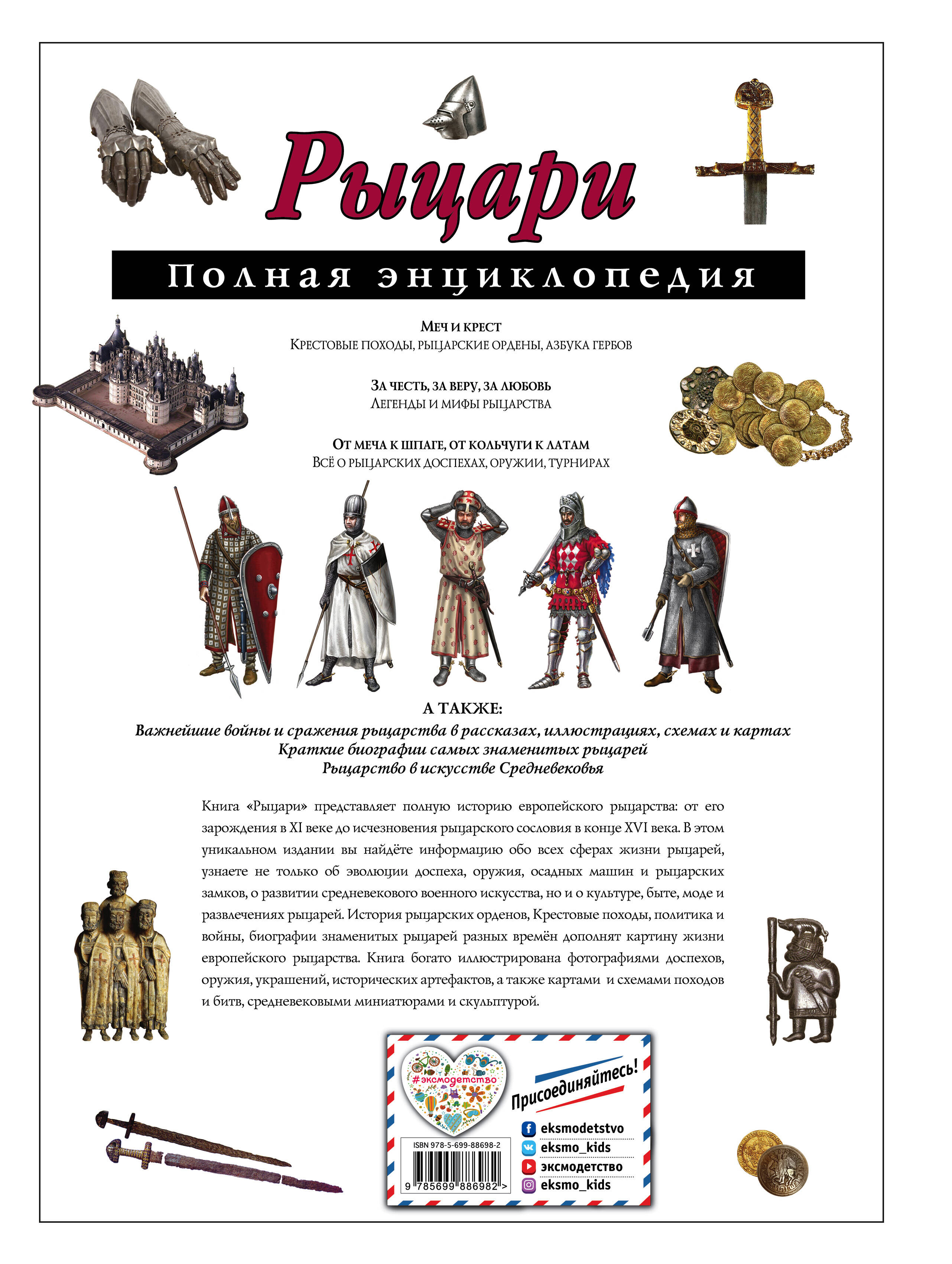 Эта энциклопедия представляет полную историю европейского рыцарства - от зарождения рыцарского сословия в XI в. до его исчезновения в конце XVI в. Это уникальное издание освещает разные стороны жизни рыцарей. Читатель узнает об эволюции военного искусства, доспеха, оружия, осадных машин и замков, познакомится с культурой, бытом, модой и развлечениями рыцарей. Книга рассказывает о Крестовых походах и рыцарских орденах, о средневековой политике и войнах, о королях и героях рыцарской эпохи. Текст дополнен великолепными авторскими иллюстрациями. Удобная современная форма подачи материала облегчает поиск и усвоение информации. Эта книга адресована школьникам, студентам и всем любителям истории.| Издательство | Эксмо |