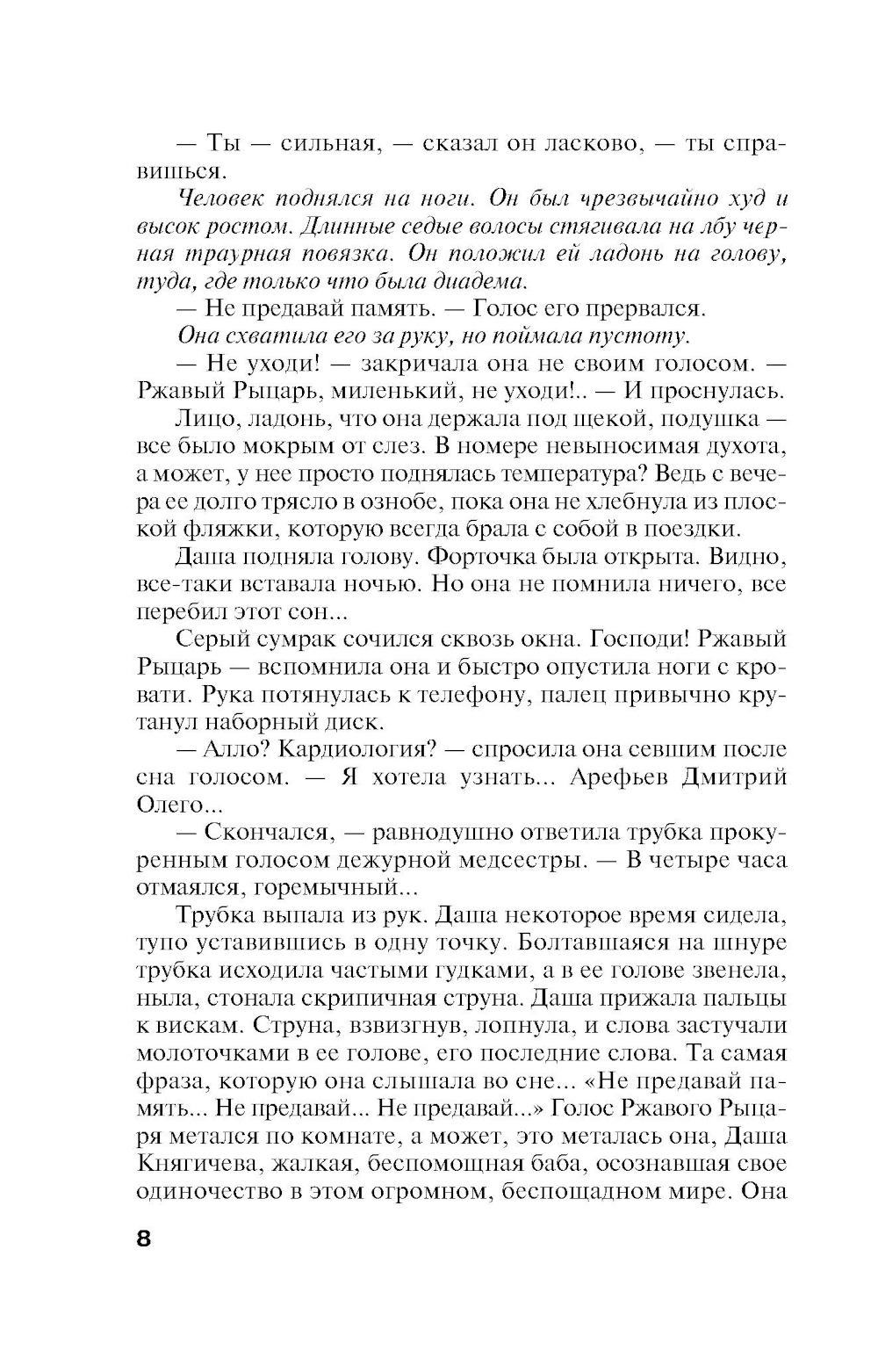 Страшное, горькое время наступило в жизни известной писательницы Дарьи Княгичевой. Она потеряла одного за другим самых близких, любимых мужчин. Первым ушел из жизни ее друг и учитель - знаменитый писатель Арефьев, который сам себя называл Ржавым Рыцарем. Двое других - любимый и друг детства - погибли лютой смертью... И Дарья чувствует свою причастность к их гибели. Тем более что другой мужчина, тоже когда-то много значивший для нее, похоже, замешан в этих преступлениях. И если убийство любимого - олигарха Павла Свиридовского - всколыхнуло всю общественность, не только в ее родном городе, но и в стране, то смерть школьного друга, художника Оляли, компетентные органы посчитали несчастным случаем. Но Даша знает, что это не так. Она отваживается поделиться своими подозрениями со следствием. Зло должно быть наказано!...| Издательство | Эксмо |