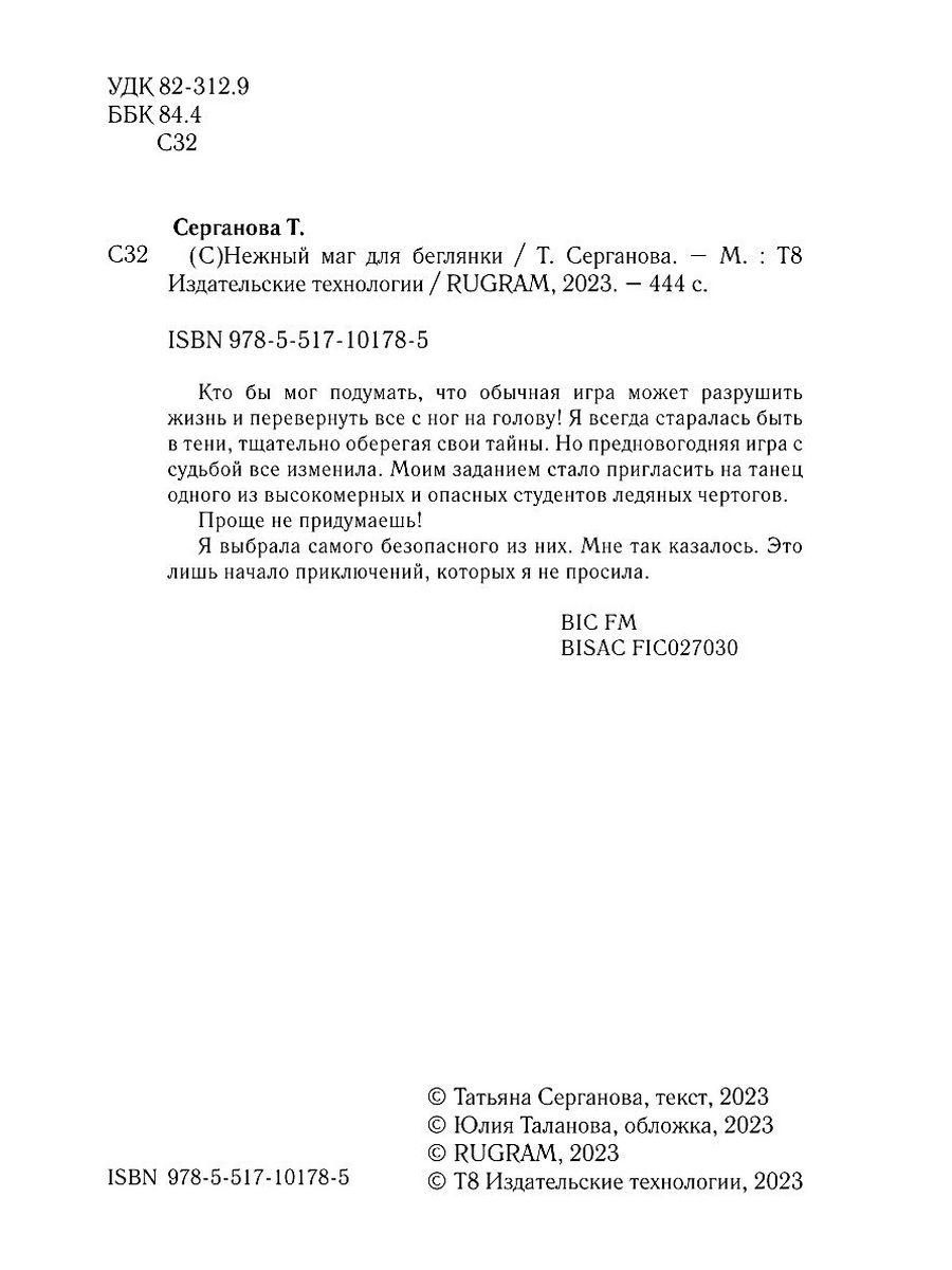 Кто бы мог подумать, что обычная игра может разрушить жизнь и перевернуть все с ног на голову! Я всегда старалась быть в тени, тщательно оберегая свои тайны. Но предновогодняя игра с судьбой все изменила. Моим заданием стало пригласить на танец одного из высокомерных и опасных студентов ледяных чертогов. Проще не придумаешь! Я выбрала самого безопасного из них. Мне так казалось. Это лишь начало приключений, которых я не просила.| Издательство | Т8 RUGRAM |