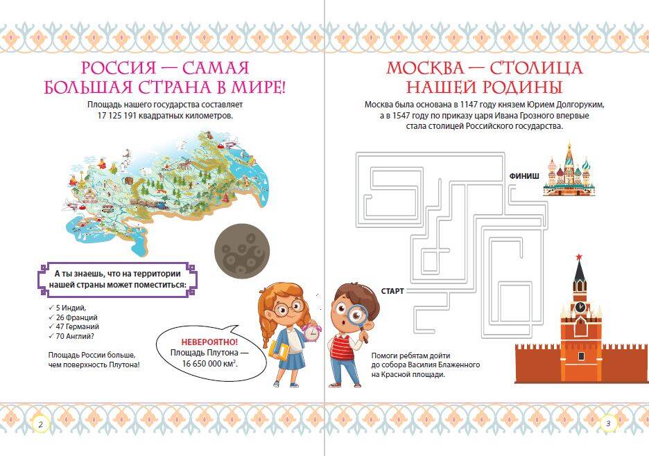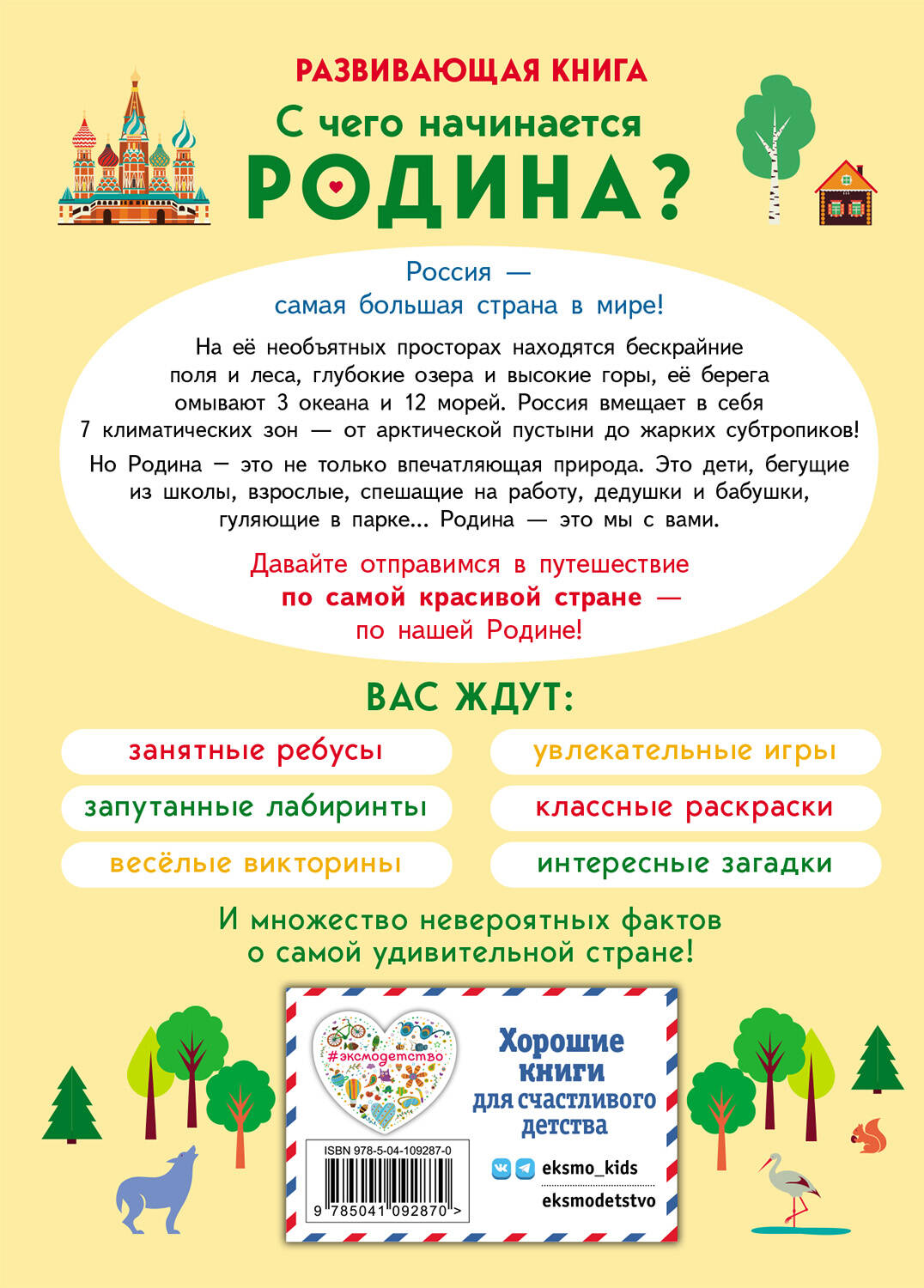 Россия - самая большая страна в мире! На её необъятных просторах находятся бескрайние поля и леса, глубокие озёра, высокие горы, её берега омывают 3 океана и 13 морей. Наша страна вмещает в себя 7 климатических зон - от арктической пустыни до жарких субтропиков! Но Родина - это не только впечатляющая природа. Это дети, бегущие из школы, взрослые, спешащие на работу, дедушки и бабушки, гуляющие в парке… Родина - это мы с вами. Давайте же отправимся в удивительное путешествие по самой красивой стране - по нашей с вами Родине! Вас ждут: - Увлекательные игры. - Классные раскраски. - Запутанные лабиринты. - Занятные ребусы. - Весёлые викторины. - Интересные загадки.| Издательство | ООО "Издательство "Эксмо" |