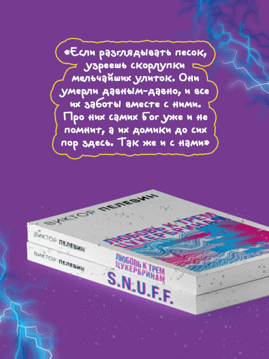 «S.N.U.F.F.» В «S.N.U.F.F» есть всё, за что читатель любит пелевинский бренд: и шутки (которые по-прежнему хочется зачитывать вслух), и парадоксально точно пойманный и засахаренный «дух времени» (многие пассажи, касающиеся оркских «священных войн», зловеще перекликаются с самыми последними событиями в России)… А то, что каждый следующий пелевинский текст оказывается неизменно печальней, пронзительней и трагичней предыдущего (в нынешнем сердце порой разрывается, как в какой-нибудь «Каштанке») - так это, вероятно, свойство самого писателя, с возрастом мигрирующего в сторону всё большего пессимизма и надрыва. «Любовь к трем цукербринам» О головокружительной, завораживающей и роковой страсти к трем цукербринам.