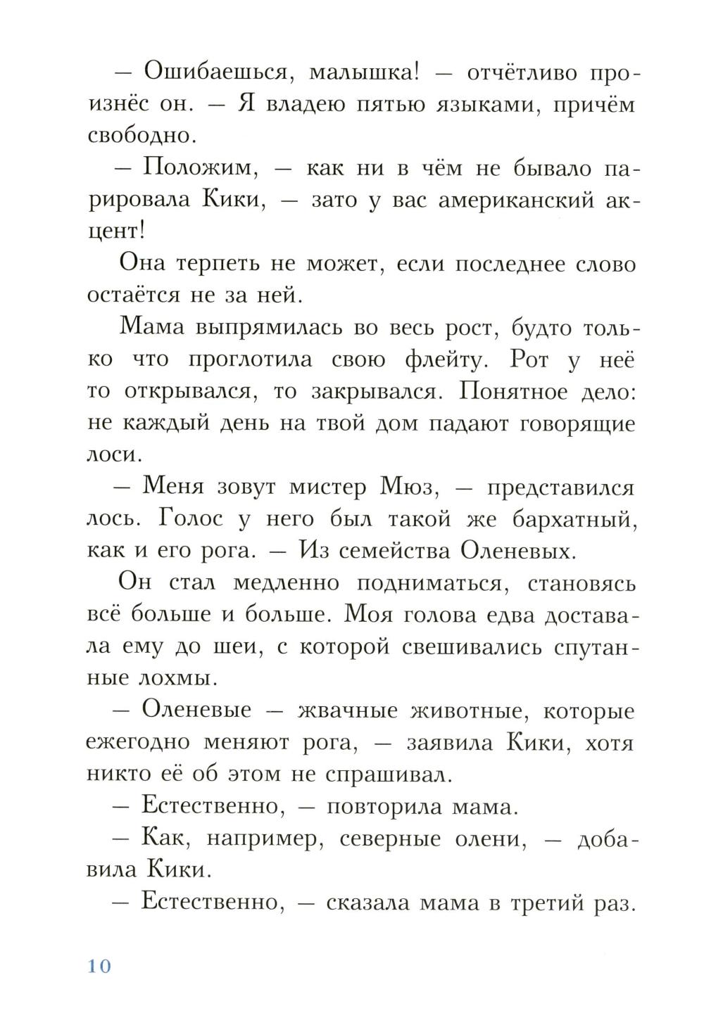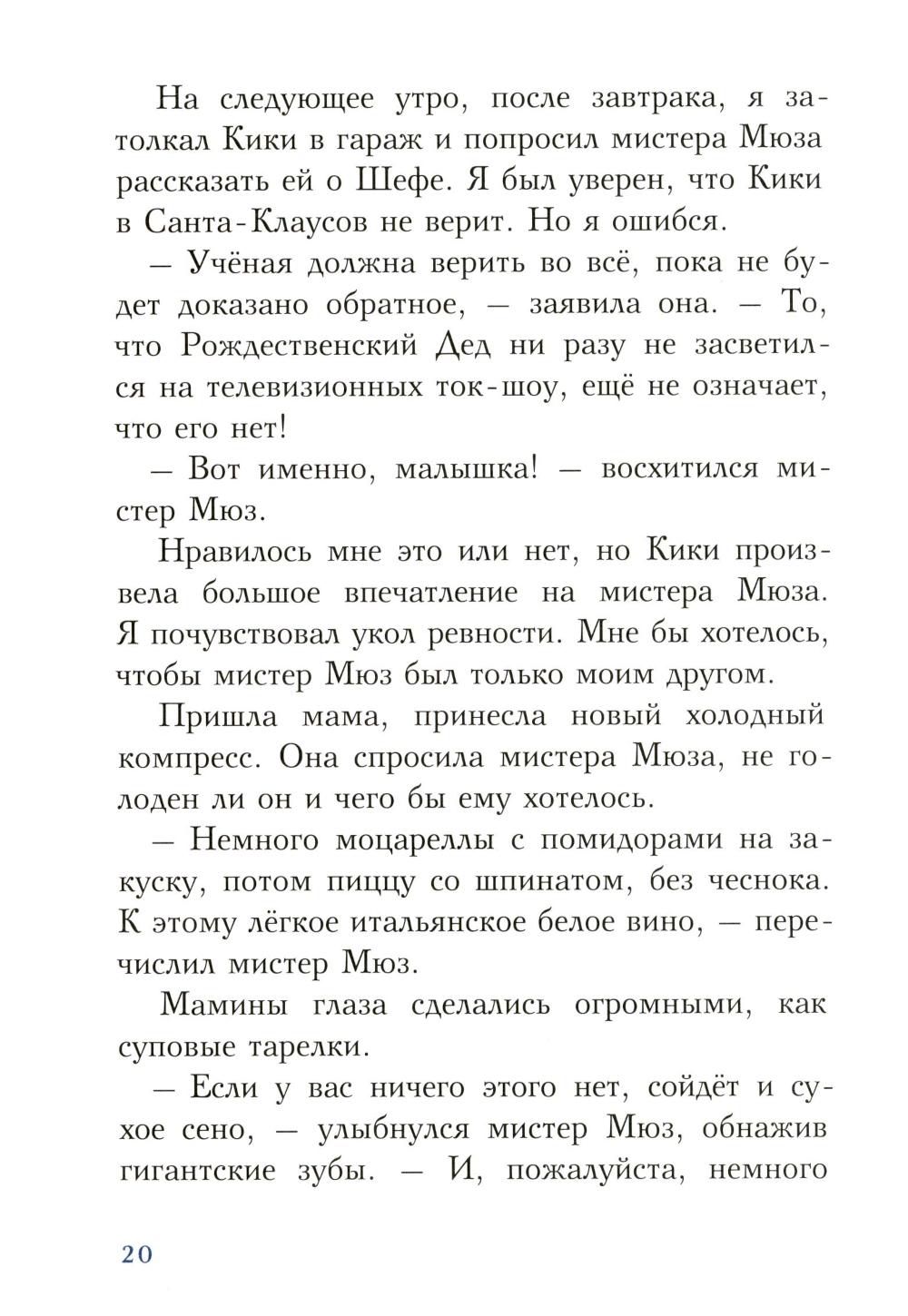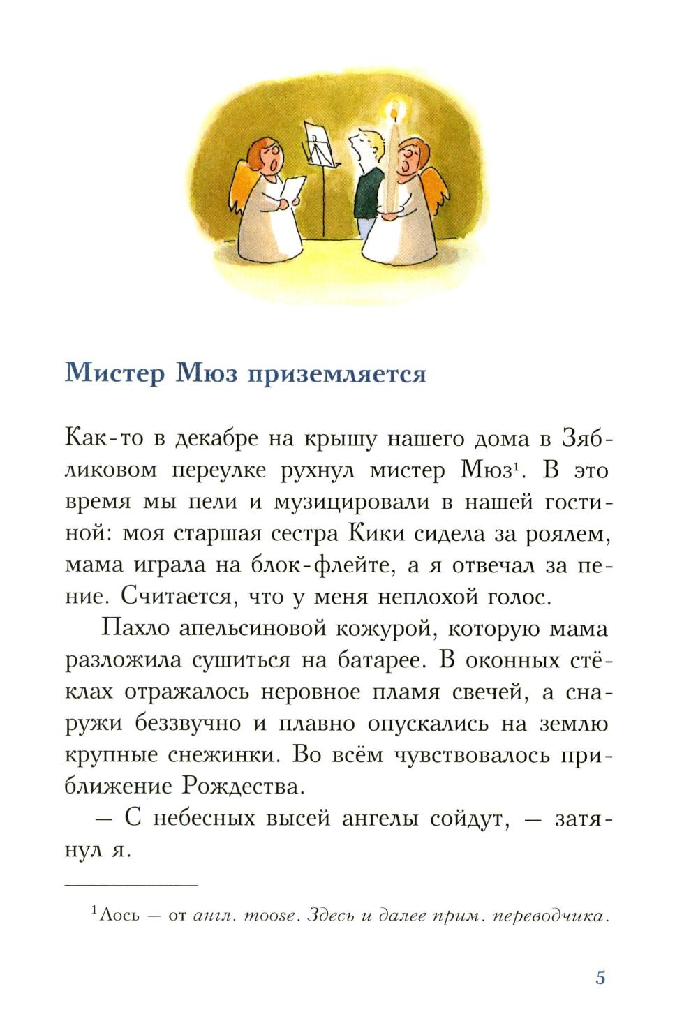 В канун Рождества в семье Вагнеров произошло кое-что невероятное. Об этом рассказывает десятилетний Бертиль. Он живет с мамой (родители в разводе) и невероятно любознательной старшей сестренкой Кики, к тому же умеющей убедительно врать. Бертиль - скептик, он не верит в Рождественские чудеса. Но когда, проломив крышу и потолок, в их дом свалился лось, ему пришлось круто изменить свое мнение. Оказывается, санки, на которых Санта-Клаус (или Рождественский Дед) развозит новогодние подарки, ежегодно обкатывают лоси, и только после тщательной проверки в них впрягают оленей. Вот такой лось неожиданно оказался гостем Вагнеров. А всё из-за того, что полозья саней оказались разболтанными, и он свалился в пике. Появление необычного гостя повлекло за собой цепочку непредвиденных, а порой забавных событий. Понятно, что такого гостя надо держать подальше от любопытных соседей. Это, ох, как непросто. Дети проявляют недюжинную изобретательность, чтобы сохранить тайну, особенно если речь идет о лучшей маминой подруге и в придачу феминистке Герлинде или о фермере и охотнике Панинке, за версту почуявшем дичь, не говоря уже о бабушке, панически боящейся крупных животных, которая приехала погостить на Рождество. Лось мистер Мюз необыкновенно хорош. Он обходителен, интеллигентен, отличный рассказчик и чуткий друг. К моменту падения в дом Вагнеров лось успел не раз облететь множество стран, повидал много интересного и свободно говорил на пяти языках. Внезапное появление Санта-Клауса, явившегося за своим лосем, повергло Бертиля, да и всю семью Вагнеров, в шок, а затем в уныние. Все они хотели бы, чтобы необыкновенный лось остался у них навсегда. Но каково будет Санта-Клаусу без мистера Мюза?| Издательство | Мелик-Пашаев |