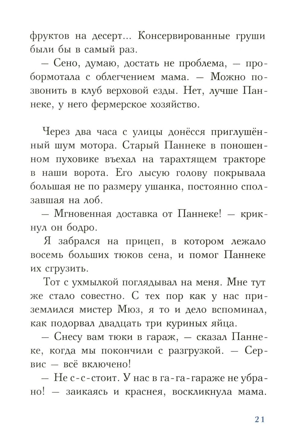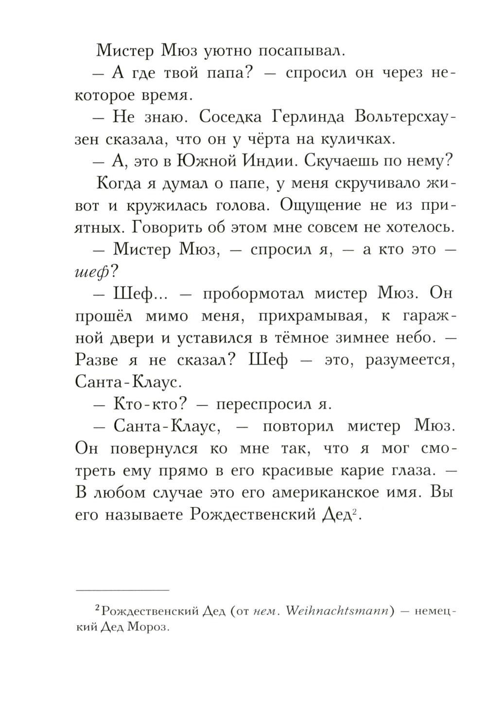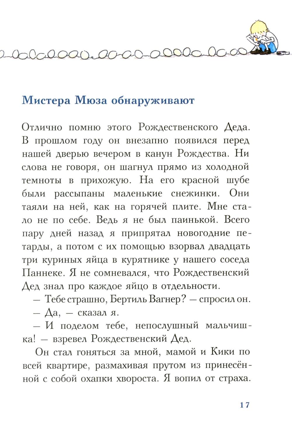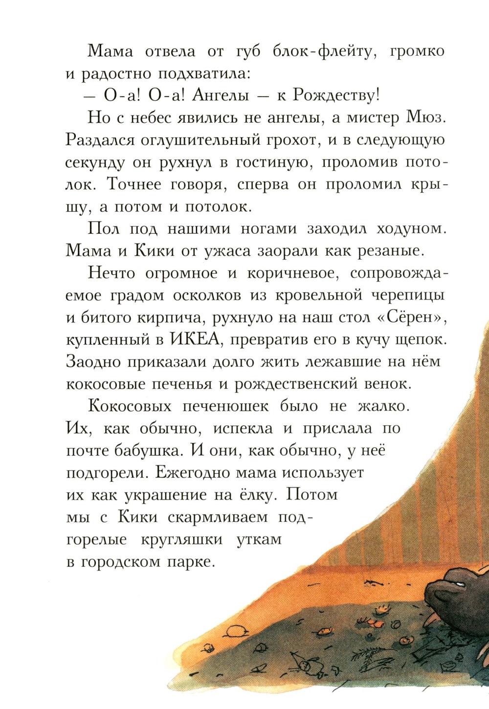 В канун Рождества в семье Вагнеров произошло кое-что невероятное. Об этом рассказывает десятилетний Бертиль. Он живет с мамой (родители в разводе) и невероятно любознательной старшей сестренкой Кики, к тому же умеющей убедительно врать. Бертиль - скептик, он не верит в Рождественские чудеса. Но когда, проломив крышу и потолок, в их дом свалился лось, ему пришлось круто изменить свое мнение. Оказывается, санки, на которых Санта-Клаус (или Рождественский Дед) развозит новогодние подарки, ежегодно обкатывают лоси, и только после тщательной проверки в них впрягают оленей. Вот такой лось неожиданно оказался гостем Вагнеров. А всё из-за того, что полозья саней оказались разболтанными, и он свалился в пике. Появление необычного гостя повлекло за собой цепочку непредвиденных, а порой забавных событий. Понятно, что такого гостя надо держать подальше от любопытных соседей. Это, ох, как непросто. Дети проявляют недюжинную изобретательность, чтобы сохранить тайну, особенно если речь идет о лучшей маминой подруге и в придачу феминистке Герлинде или о фермере и охотнике Панинке, за версту почуявшем дичь, не говоря уже о бабушке, панически боящейся крупных животных, которая приехала погостить на Рождество. Лось мистер Мюз необыкновенно хорош. Он обходителен, интеллигентен, отличный рассказчик и чуткий друг. К моменту падения в дом Вагнеров лось успел не раз облететь множество стран, повидал много интересного и свободно говорил на пяти языках. Внезапное появление Санта-Клауса, явившегося за своим лосем, повергло Бертиля, да и всю семью Вагнеров, в шок, а затем в уныние. Все они хотели бы, чтобы необыкновенный лось остался у них навсегда. Но каково будет Санта-Клаусу без мистера Мюза?| Издательство | Мелик-Пашаев |