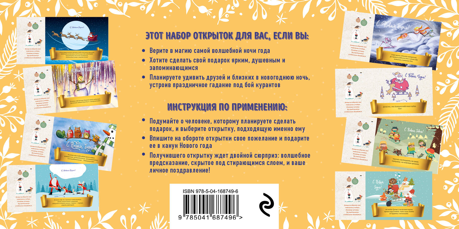 12 красивых новогодних открыток. На лицевой стороне каждой открытки под скретч-слоем, стереть который можно любым металлическим предметом, находится остроумное и веселое предсказание. На оборотной стороне - форма для самостоятельного заполнения, в которую вы можете вписать свои пожелания родным и друзьям к Новому году. Инструкция по применению: • Подумайте о человеке, которому планируете сделать подарок, и выберите открытку, подходящую именно ему (в книге есть подсказки, какие именно предсказания находятся под стирающимся слоем). • Впишите на обороте открытки свое пожелание и подарите ее в канун Нового года. • Получившего открытку ждет двойной сюрприз: веселое шуточное предсказание, скрытое под стирающимся слоем, и ваше личное поздравление!| Издательство | ООО "Издательство "Эксмо" |