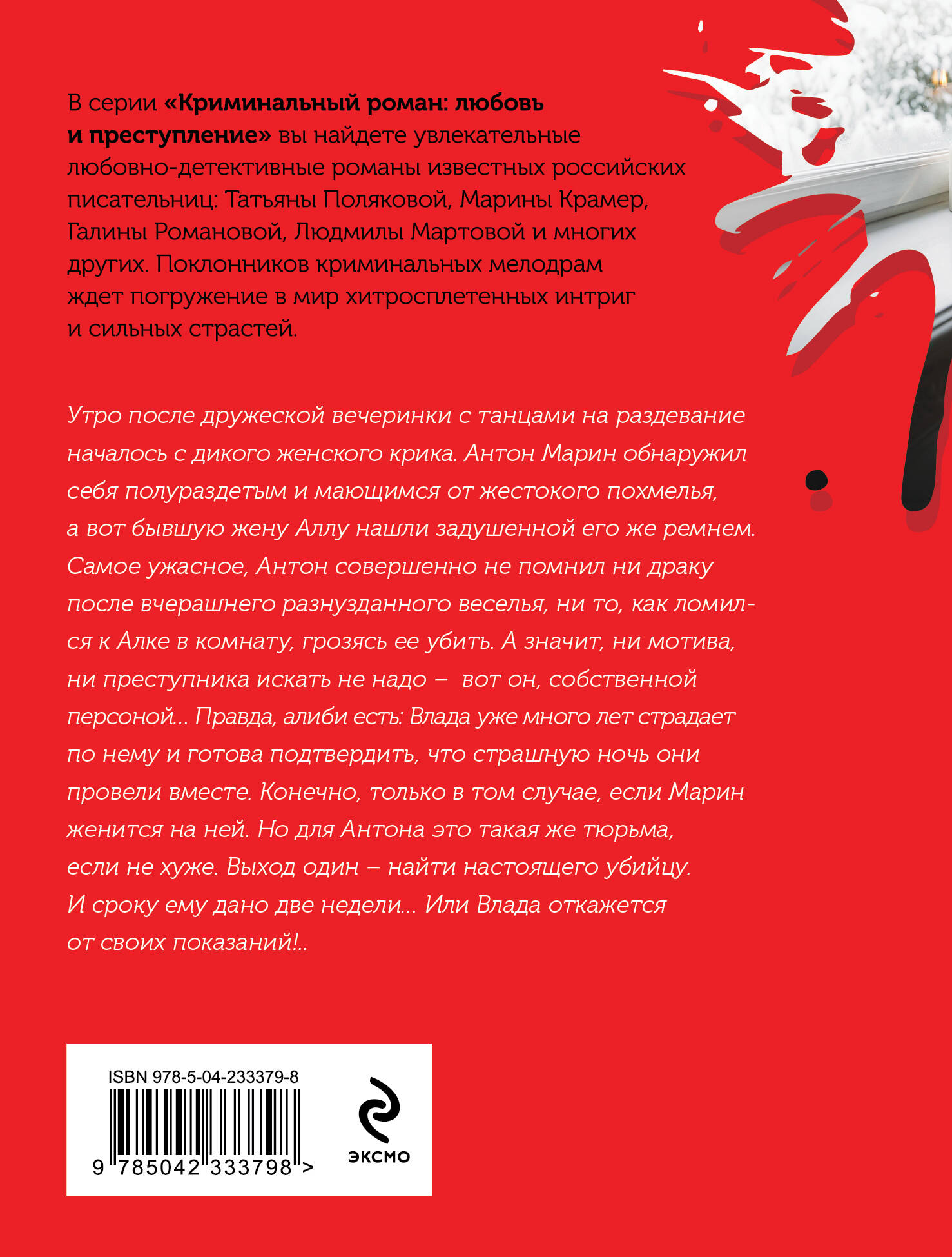 Утро после дружеской вечеринки с танцами на раздевание началось с дикого женского крика. Антон Марин обнаружил себя полураздетым и мающимся от жестокого похмелья, а вот бывшую жену Аллу нашли задушенной его же ремнем. Самое ужасное, Антон совершенно не помнил ни драку после вчерашнего разнузданного веселья, ни то, как ломился к Алке в комнату, грозясь ее убить. А значит, ни мотива, ни преступника искать не надо - вот он, собственной персоной… Правда, алиби есть: Влада уже много лет страдает по нему и готова подтвердить, что страшную ночь они провели вместе. Конечно, только в том случае, если Марин женится на ней. Но для Антона это такая же тюрьма, если не хуже. Выход один - найти настоящего убийцу. И сроку ему дано две недели… Или Влада откажется от своих показаний!.. В детективных мелодрамах Галины Романовой переплелись и кровь, и слезы, и любовь. Все, как в жизни! Нежные чувства проверяются настоящими испытаниями, где награда - сама жизнь. Каждая история по-своему уникальна и не кажется вымыслом! И все они объединены общей темой: настоящая любовь всегда побеждает, а за преступлением непременно следует наказание.| Издательство | ООО "Издательство "Эксмо" |