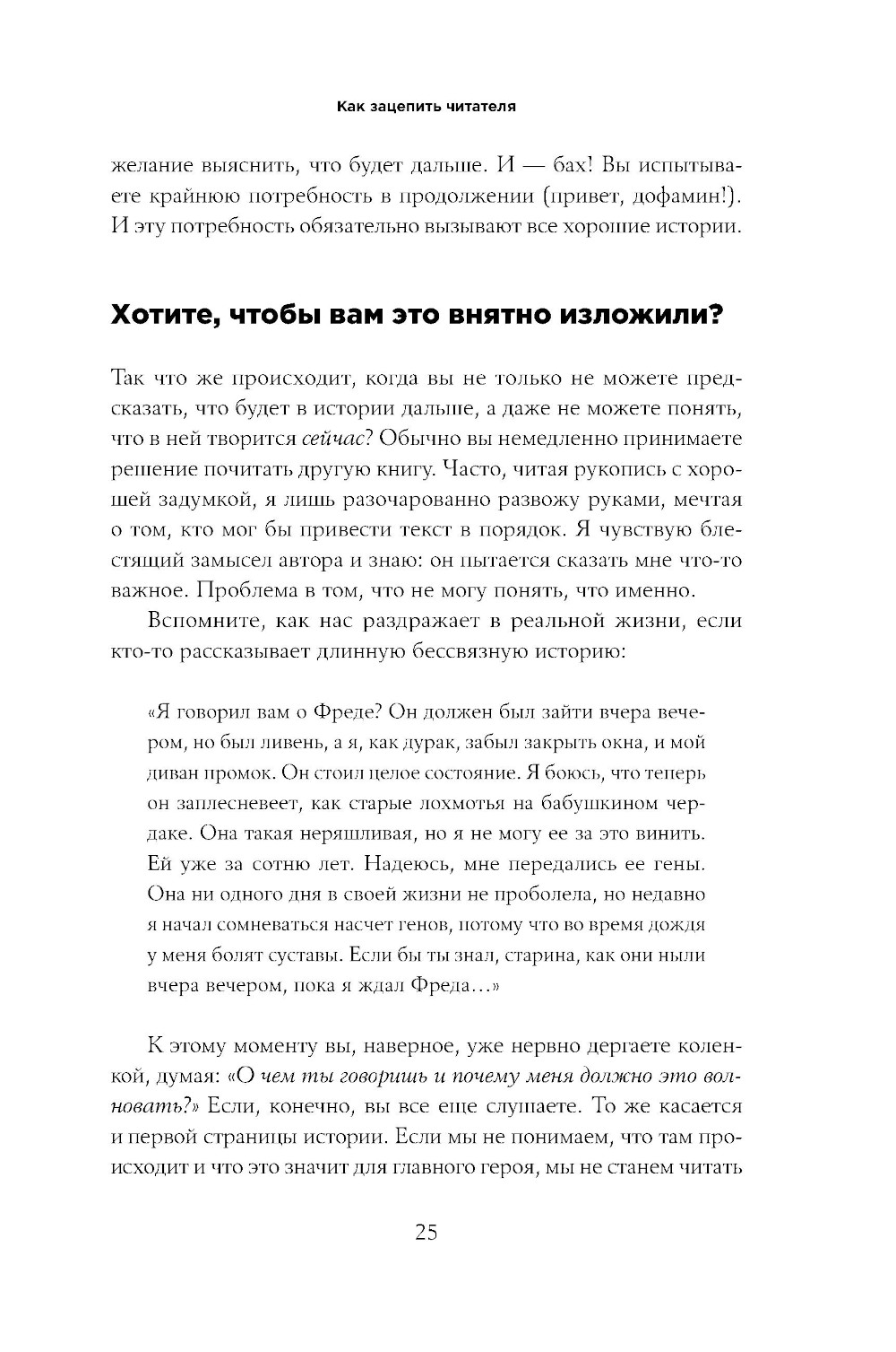 Если вы собираетесь написать книгу, знайте: ваш безупречный стиль, красивые метафоры, яркие персонажи, достоверность событий могут и не сработать, если сама история будет неинтересной. История должна интриговать и держать внимание читателя до последней фразы, потому что наш мозг воспринимает такие истории как жизненный опыт, необходимый для выживания. По такому принципу построены все шедевры мировой литературы. Зная о реакциях мозга на тот или иной сюжетный ход - например, о его способности проецировать проблемы героев на своего обладателя и подсознательно искать лучший выход из сложной ситуации или о стремлении разбираться в чужих ошибках, чтобы совершать поменьше своих, - можно сконструировать бестселлер. Лиза Крон, базируясь на последних достижениях неврологии и когнитивной психологии, дает писателям очень важные советы и подсказки. В книге «С первой фразы», написанной с тонким юмором и глубоким знанием темы, вы также найдете примеры из романов, сценариев и рассказов. В каждой главе рассматривается один из аспектов работы мозга и даются советы по применению этого знания на практике.| Издательство | Альпина Паблишер |