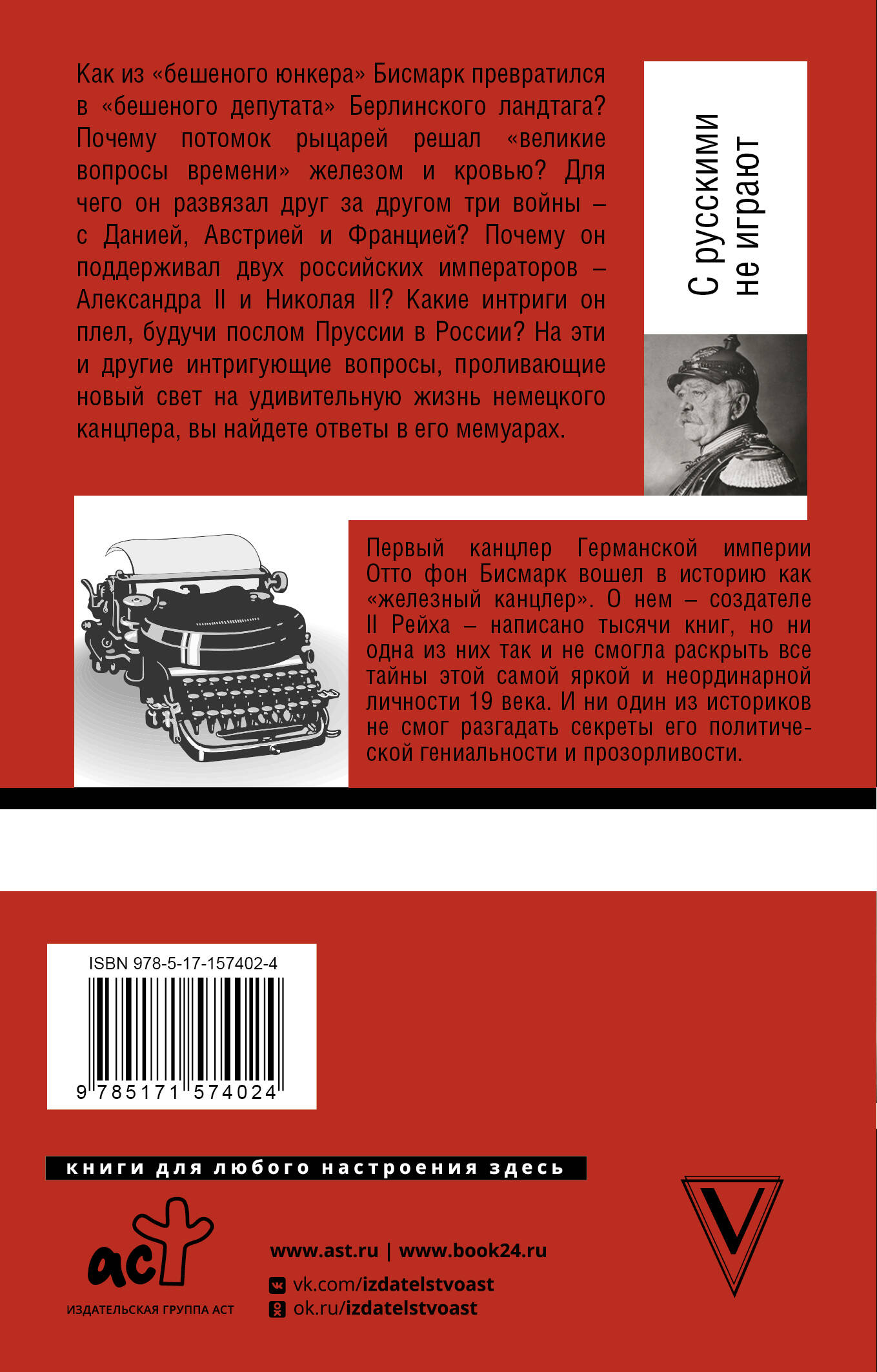 Чем закончилась страстная лю- бовь Бисмарка и юной русской княгини Екатерины ОрловойТрубецкой? Какие предупреждения Бис- марка о грядущих военных конфликтах полностью сбылись? А какие его оценки будущего, которое ожи- дает мир, не потеряли актуальности и в наши дни? На эти и другие интригующие вопросы, проливаю- щие новый свет на удивительную жизнь немецкого канцлера, вы найдете ответы в его мемуарах.| Издательство | ИЗДАТЕЛЬСТВО "АСТ" |
