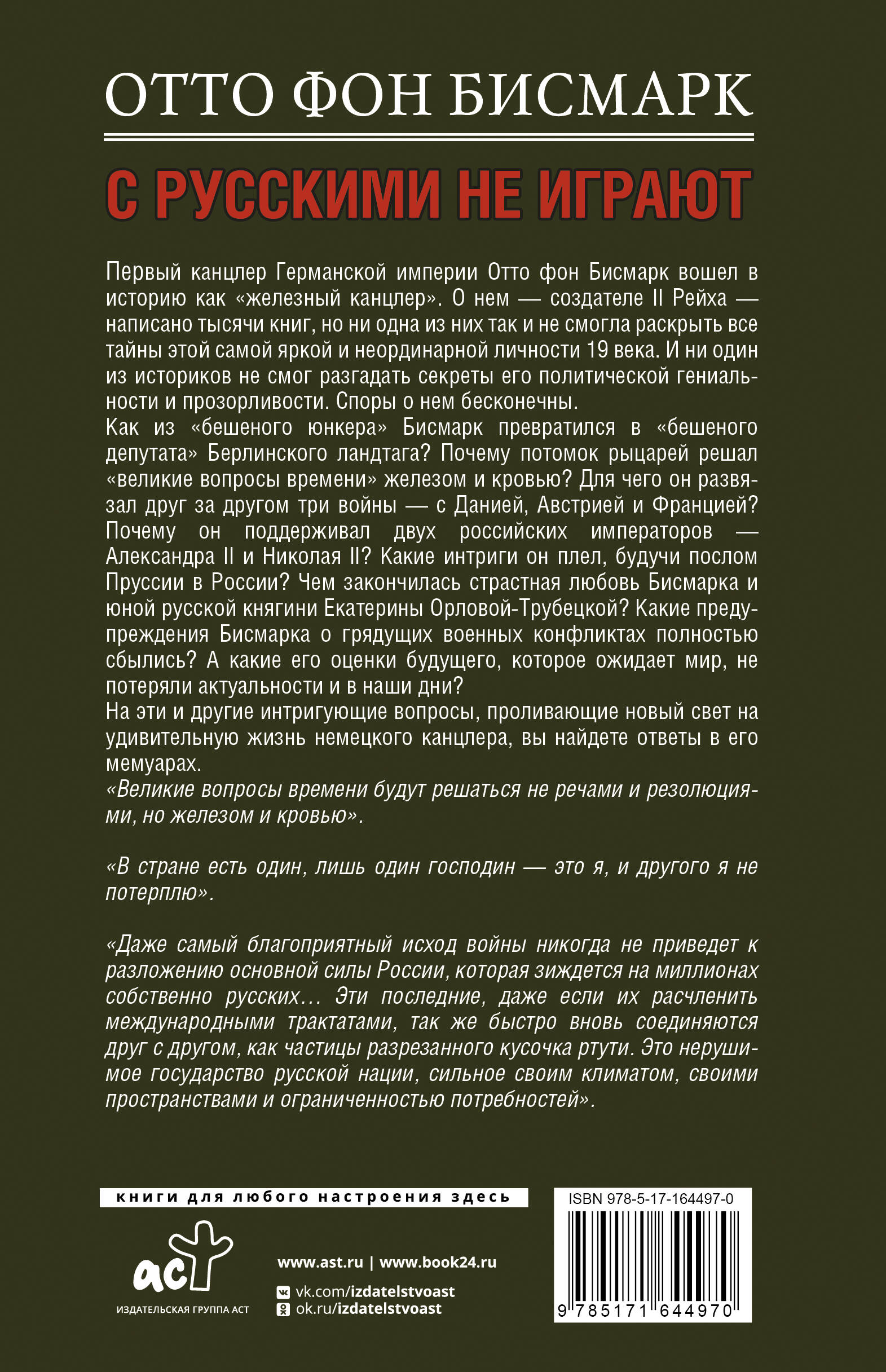 Первый канцлер Германской империи Отто фон Бисмарк вошел в историю как "железный канцлер". О нем - создателе II Рейха - написано тысячи книг, но ни одна из них так и не смогла раскрыть все тайны этой самой яркой и неординарной личности 19 века. И ни один из историков не смог разгадать секреты его политической гениальности и прозорливости. Споры о нем бесконечны. Как из "бешеного юнкера" Бисмарк превратился в "бешеного депутата" Берлинского ландтага? Почему потомок рыцарей решал "великие вопросы времени" железом и кровью? Для чего он развязал друг за другом три войны - с Данией, Австрией и Францией? Почему он поддерживал двух российских императоров - Александра II и Николая II? Какие интриги он плел, будучи послом Пруссии в России? Чем закончилась страстная любовь Бисмарка и юной русской княгини Екатерины Орловой-Трубецкой? Какие предупреждения Бисмарка о грядущих военных конфликтах полностью сбылись? А какие его оценки будущего, которое ожидает мир, не потеряли актуальности и в наши дни? На эти и другие интригующие вопросы, проливающие новый свет на удивительную жизнь немецкого канцлера, вы найдете ответы в его мемуарах.| Издательство | Издательство "АСТ" |
