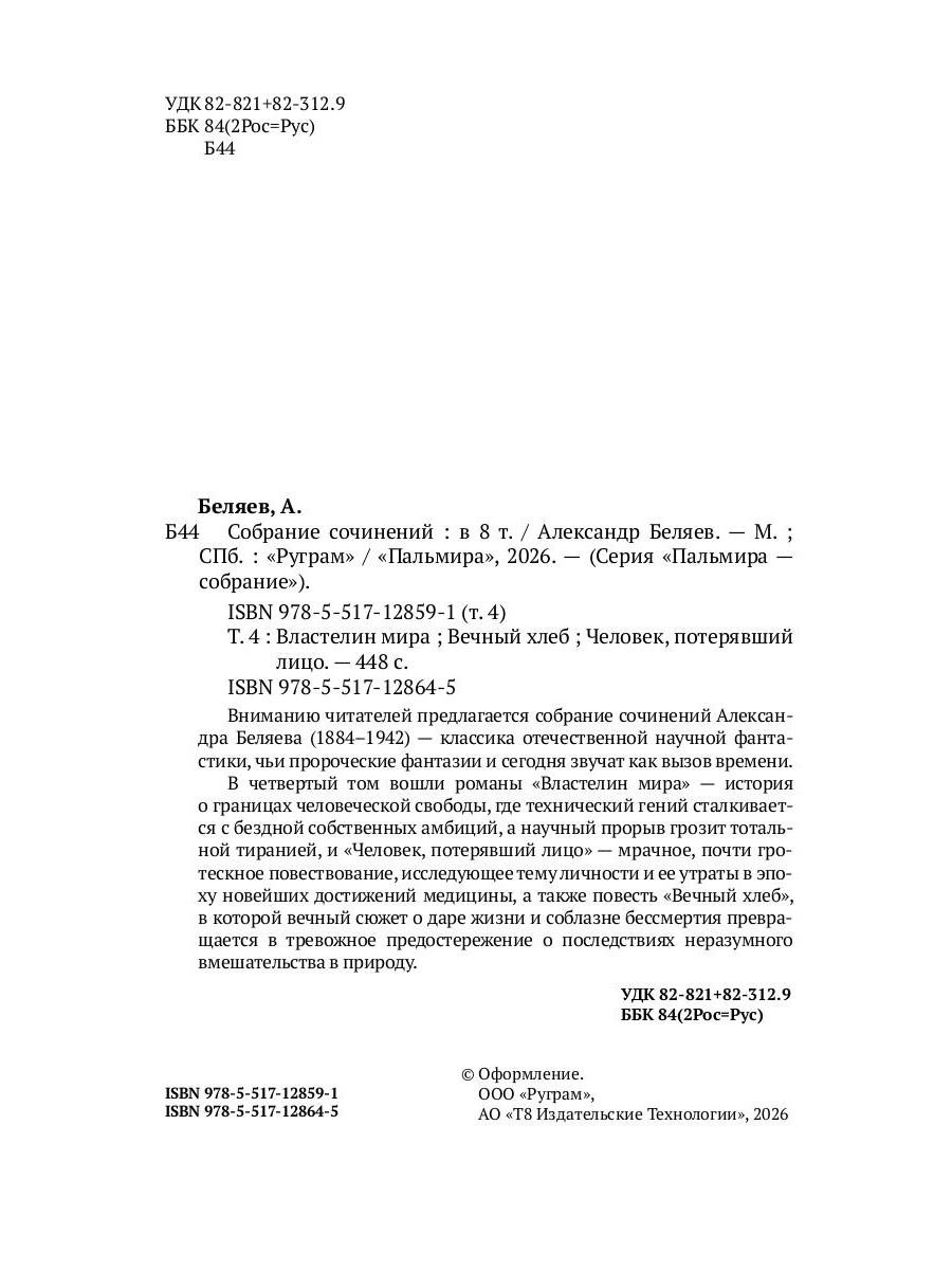 Вниманию читателей предлагается собрание сочинений Александра Беляева (1884-1942) - классика отечественной научной фантастики, чьи пророческие фантазии и сегодня звучат как вызов времени. В четвертый том вошли романы «Властелин мира» - история о границах человеческой свободы, где технический гений сталкивается с бездной собственных амбиций, а научный прорыв грозит тотальной тиранией, и «Человек, потерявший лицо» - мрачное, почти гротескное повествование, исследующее тему личности и ее утраты в эпоху новейших достижений медицины, а также повесть «Вечный хлеб», в которой вечный сюжет о даре жизни и соблазне бессмертия превращается в тревожное предостережение о последствиях неразумного вмешательства в природу.| Издательство | Т8 RUGRAM |