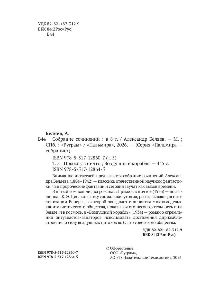 Вниманию читателей предлагается собрание сочинений Александра Беляева (1884-1942) - классика отечественной научной фантастики, чьи пророческие фантазии и сегодня звучат как вызов времени. В пятый том вошли два романа: «Прыжок в ничто» (1933) - посвященная К. Э. Циолковскому социальная утопия, рассказывающая о колонизации Венеры, в которой звездолет становится микромоделью капиталистического общества, показывая его несостоятельность и на Земле, и в космосе, и «Воздушный корабль» (1934) - роман о стремлении энтузиастов-авиаторов использовать достижения дирижаблестроения и силу воздушных потоков во благо советского общества.| Издательство | Т8 RUGRAM |