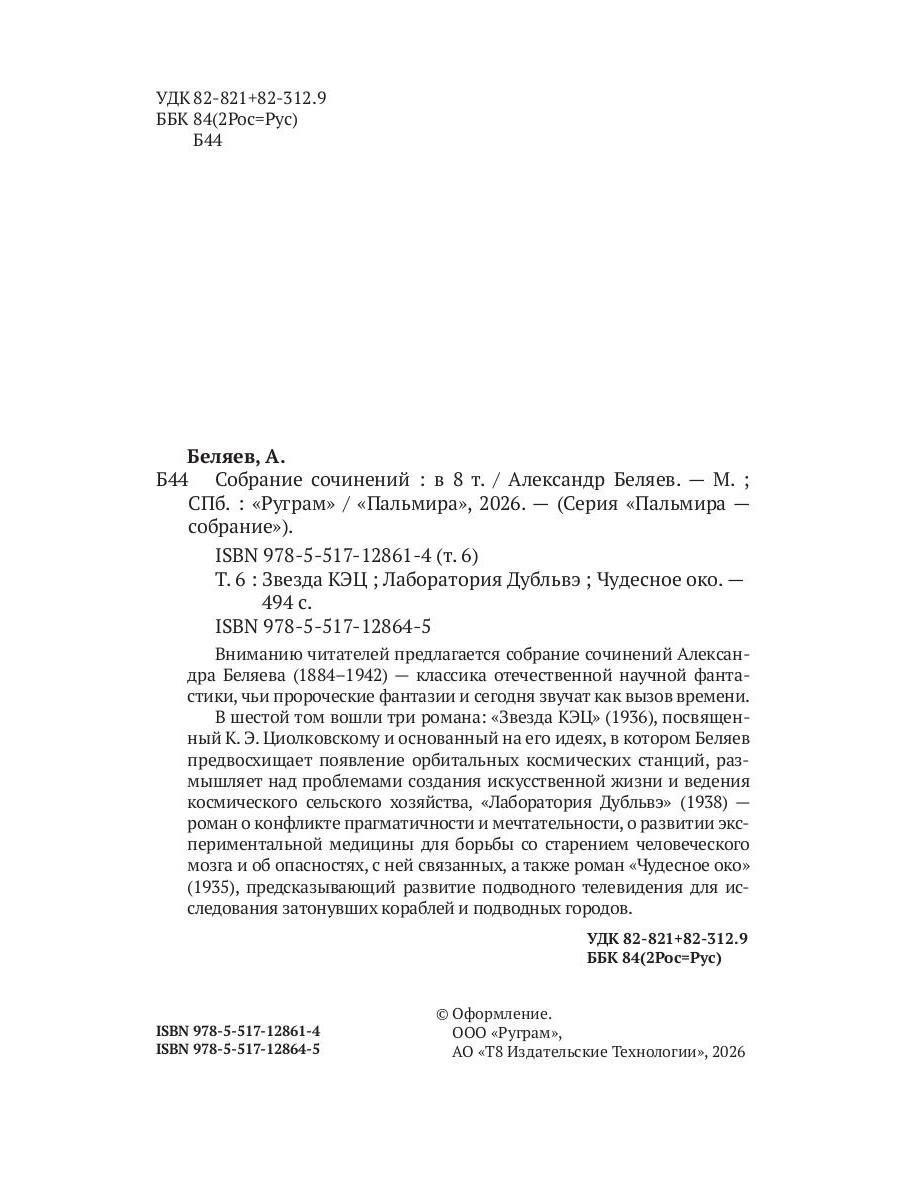 Вниманию читателей предлагается собрание сочинений Александра Беляева (1884-1942) - классика отечественной научной фантастики, чьи пророческие фантазии и сегодня звучат как вызов времени. В шестой том вошли три романа: «Звезда КЭЦ» (1936), посвященный К. Э. Циолковскому и основанный на его идеях, в котором Беляев предвосхищает появление орбитальных космических станций, размышляет над проблемами создания искусственной жизни и ведения космического сельского хозяйства, «Лаборатория Дубльвэ» (1938) - роман о конфликте прагматичности и мечтательности, о развитии экспериментальной медицины для борьбы со старением человеческого мозга и об опасностях, с ней связанных, а также роман «Чудесное око» (1935), предсказывающий развитие подводного телевидения для исследования затонувших кораблей и подводных городов.| Издательство | Т8 RUGRAM |