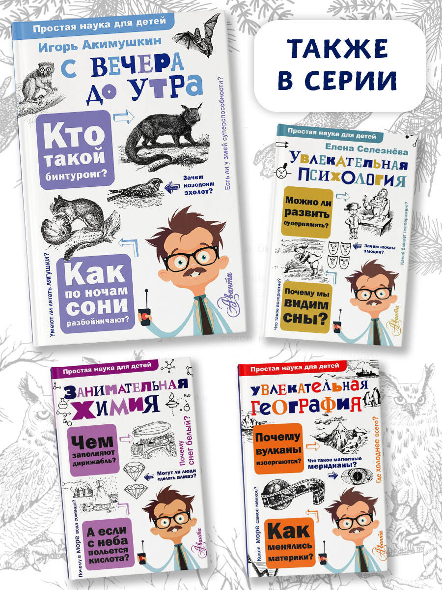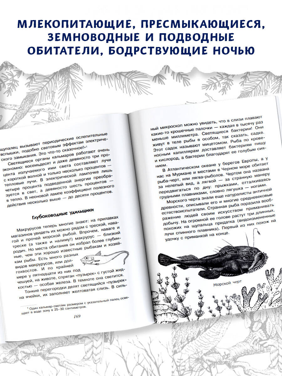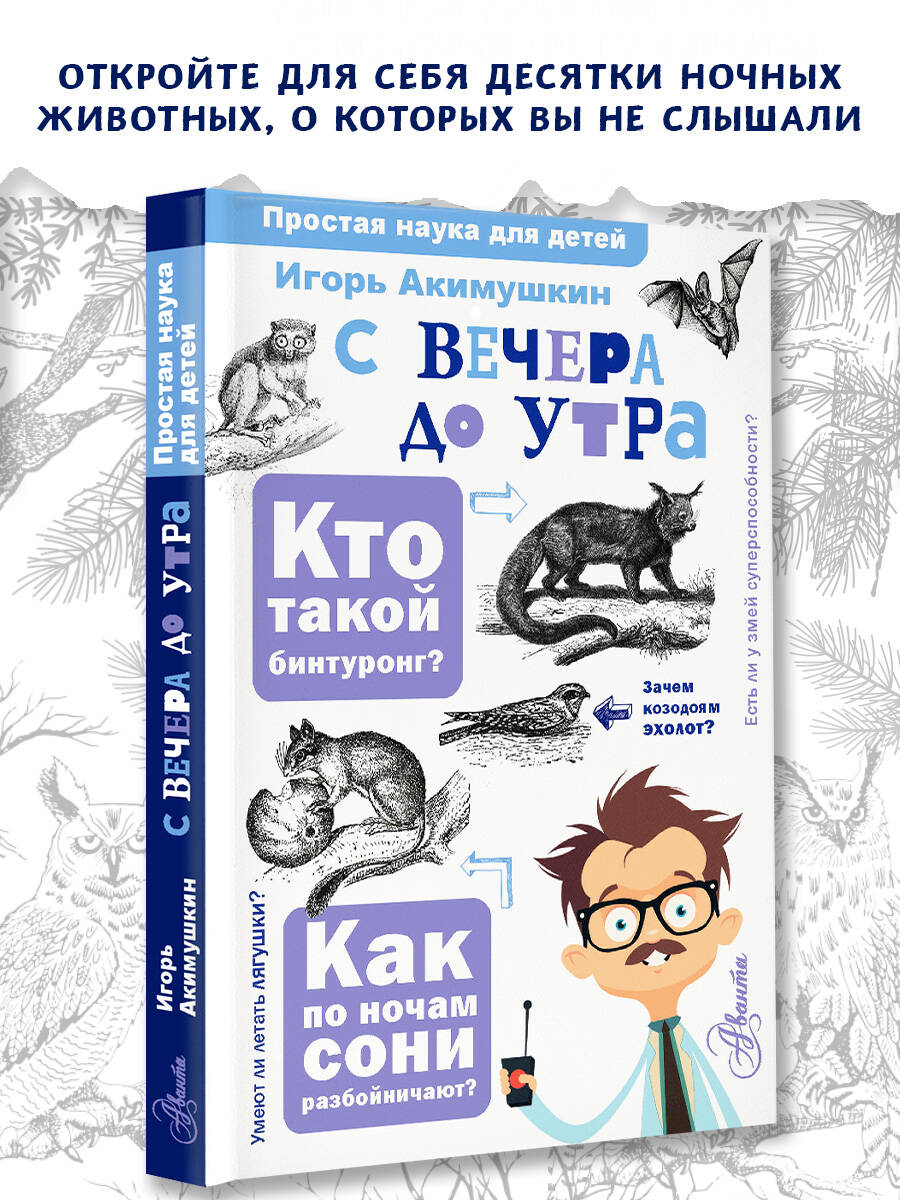 Сколько животных, ведущих ночной образ жизни, вы знаете? На ум приходят ежи, змеи, лемуры, еноты, пекари, летучие мыши, обезьяны ревуны... Но на самом деле таких животных гораздо и гораздо больше! И у всех них есть свои суперспособности, помогающие или ориентироваться в темноте, или светиться, привлекая внимание, или парить с ветки на ветку, как птицы. Ведь, оказывается, некоторые лягушки, змеи и ящерицы умеют по-своему летать, а кроме летучих мышей есть летучие лисицы, шерстокрылы и прочие звери-летуны. Книга Игоря Акимушкина "С вечера до утра", поведает о повадках ночных животных и птиц. Еще более загадочных, чем дневных, так как мы редко их наблюдаем воочию, но не менее интересных! Для среднего школьного возраста.| Издательство | Издательство "АСТ" |