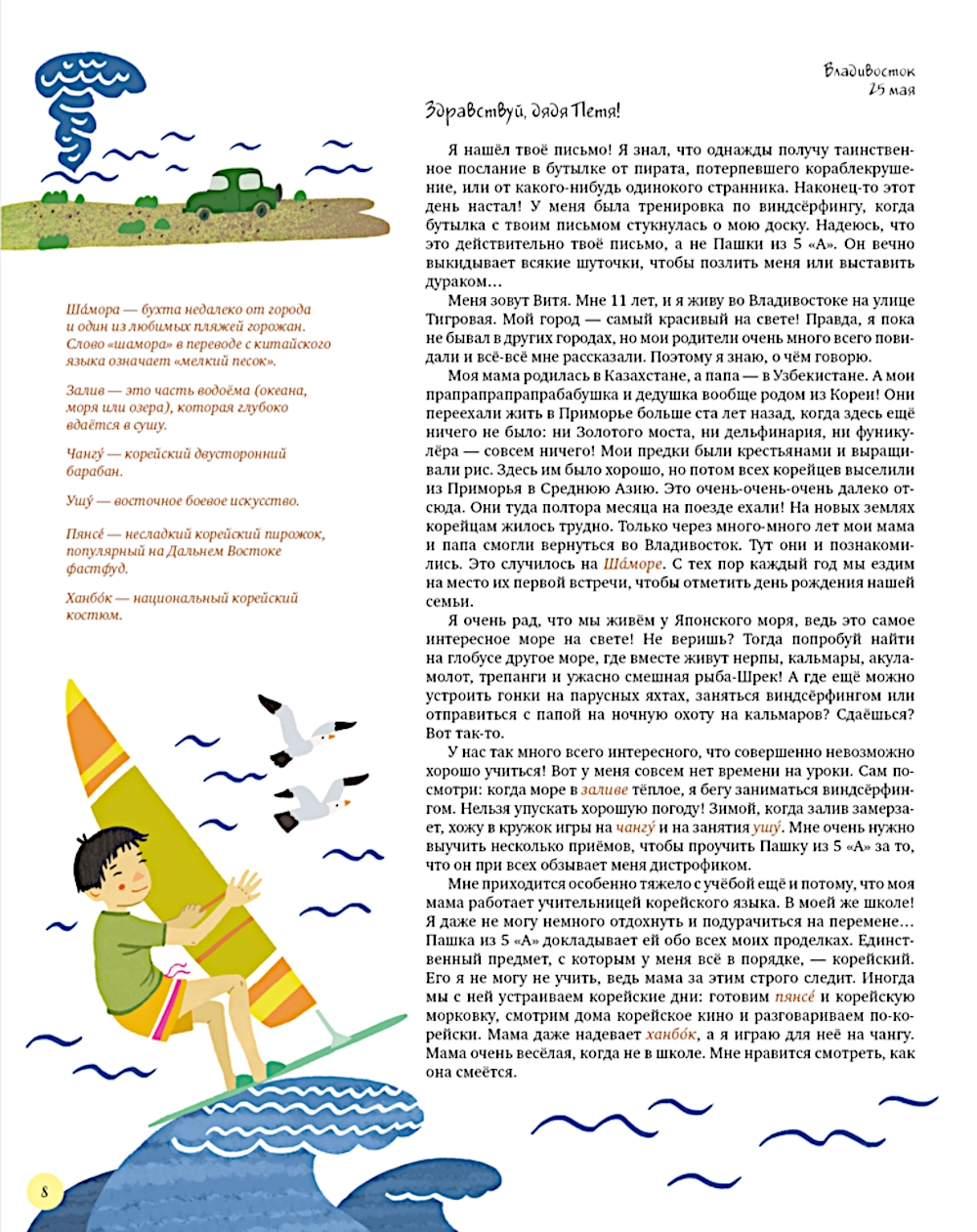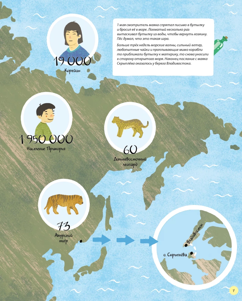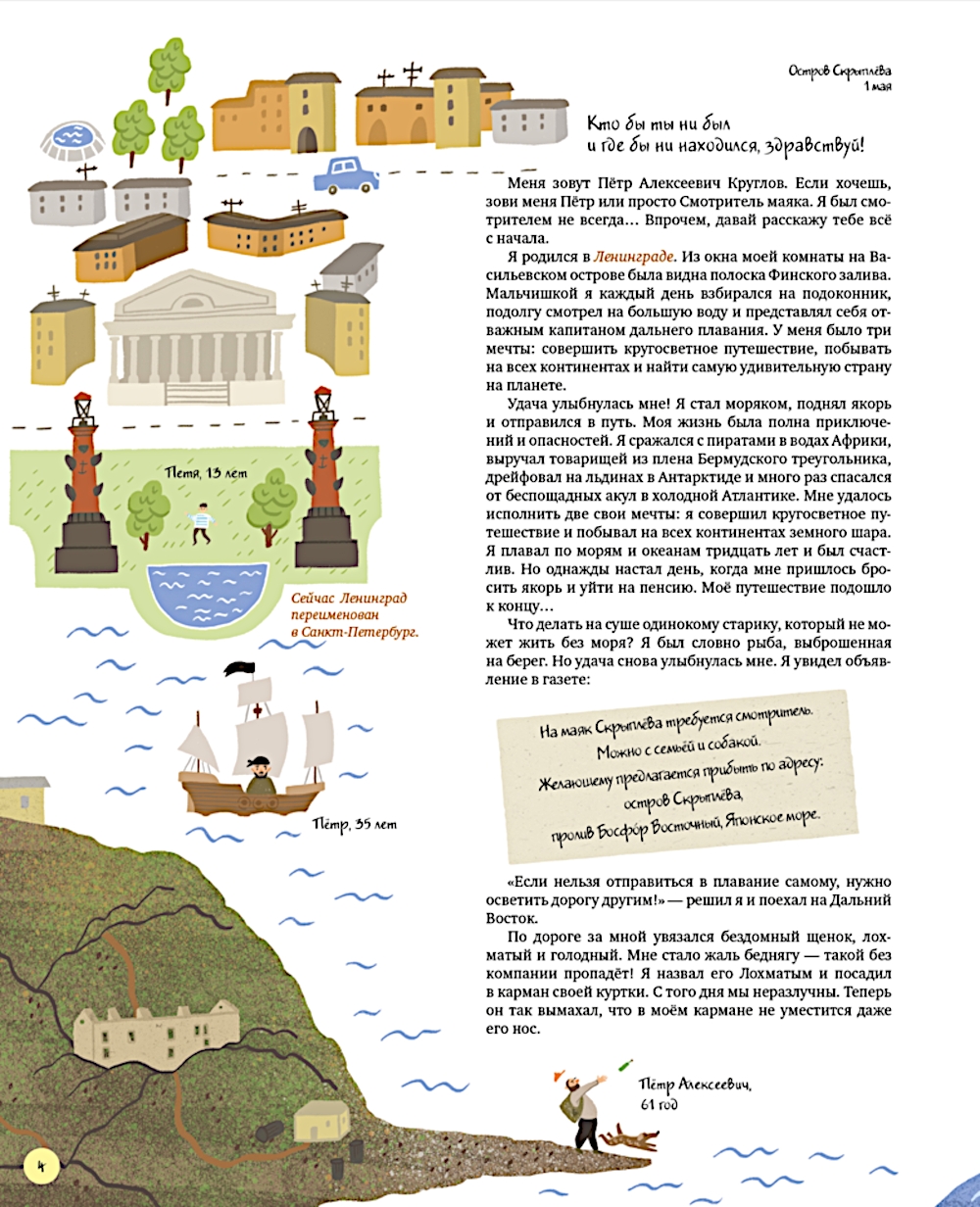 Отправить письмо бутылочной почтой решил смотритель маяка Пётр Круглов. Он попросил каждого, кому попадёт в руки его послание, дополнить его небольшим письмом о себе: где человек живёт, как проводит время, какие традиции есть в его семье и окружении. Бутылка странствует по огромной территории России, от Владивостока до Санкт-Петербурга, оказываясь в местах, где подавляющему большинству читателей наверняка не доводилось бывать. И люди, выловившие бутылку, дополняют послание в ней своим рассказом - как им живётся в вечной мерзлоте; какие традиции есть у горных народов; почему на Урале люди даже разговаривают чуть иначе, чем в Центральной России.| Издательство | ИД КомпасГид |
