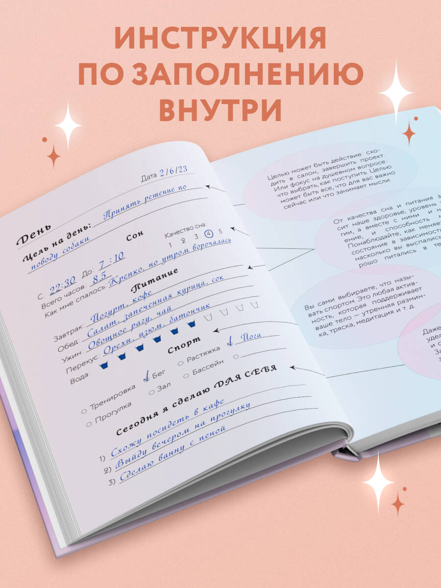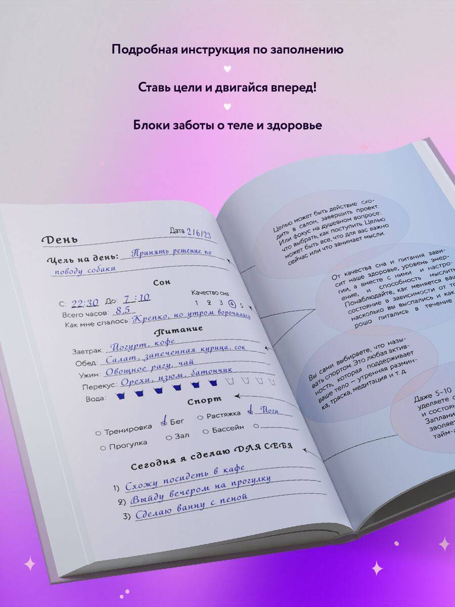 Этот блокнот - чудесная компания для всех, кто хочет оставаться «здесь и сейчас», всегда хорошо себя чувствовать и улучшать качество жизни. Внутри удобная сетка для дневной и вечерней рефлексии, которая позволяет отслеживать свои цели, держась фокус на важном и находить время для восстановления и отдыха. В нашем плотном ежедневном графике легко потерять фокус на настоящем моменте и на том, что для нас действительно важно. В этом блокноте найдется место для записи ваших мыслей и чувств, активностей и отдыха. Ежедневная запись позволит отслеживать ваше состояние в динамике и видеть, какие события и сферы жизнь как влияют на ваше здоровье и эмоциональное состояние - и регулировать присутствие тех или иных вещей в своей жизни, постепенно восполнять ресурс своей энергии и поддерживать его на высоком уровне. Что будет поддерживать вас на пути к бережности и заботе о себе: • Отслеживание ритма сна и восстановление режима для хорошего самочувствия. • Планирование времени для себя. Даже 5-10 минут, которые вы направите для восполнения своей энергии, дадут колоссальный результат. • Поддержка здоровья. Блоки для ненавязчивого отслеживания физической активности и питания, которые будут поддерживать ваш организм. • Вечерняя рефлексия и работа с энергозатратными событиями. Поможет включаться в жизнь и внимательно наблюдать за тем, что приносит вам силы, а что забирает их. • Планирование и подведение итогов позволит всегда держать в фокусе самое важное и не забывать о том, что вам ценно развивать и поддерживать в жизни!| Издательство | ООО "Издательство "Эксмо" |