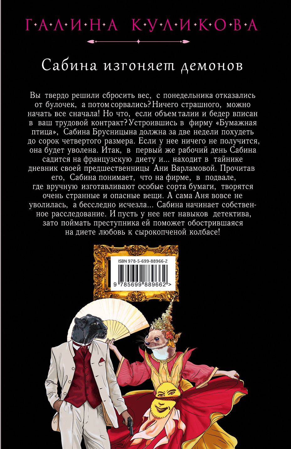 Зачем владельцу фирмы по пошиву спортивной одежды подыскивать на место секретарши девушку, которая должна обладать крепкими нервами, смелостью и отвагой? Сабине Брусницыной не потребовалось много времени для того чтобы выяснить - все дело в привидениях. Здравомыслящая Сабина, не верившая во всякого рода чертовщину, твердо намерена изгнать их со склада готовой продукции. Но внезапно она усомнилась в своих здравомыслии и отваге - вместо безобидных привидений ее начинают преследовать демоны. Их главными жертвами становятся бизнесмены - бывшие одноклассники, которые когда-то давно объединились в тайное общество. Поговаривают, что ребята занимались колдовством и вызывали духов. Возможно, один из этих духов оказался слишком кровожадным и злопамятным? Или кому-то выгодно свалить вину на дьявольских созданий? Только у Сабины есть шанс выяснить истину…
