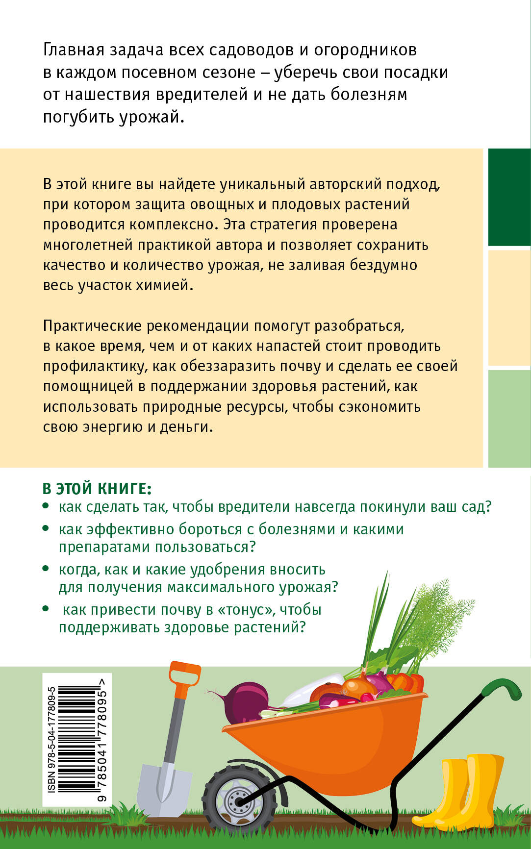 Одна из основных задач всех дачников в каждом посевном сезоне - уберечь свой сад и огород от нашествия вредителей и не дать болезням погубить урожай. Как уберечь растения от рисков, но при этом не отравить урожай химикатами? В книге известного автора, садовода с 50-летним стажем Галины Кизимы представлена идеальная стратегия защиты от болезней и вредителей без применения ядов. Практические рекомендации помогут разобраться, в какое время и от каких напастей стоит проводить профилактику и как бороться с вредителями и болезнями системно, не убивая на эту задачу все силы. В этой книге вы найдете уникальный авторский подход, при котором защита овощных и плодовых растений проводится комплексно. Авторские рекомендации помогут обеззаразить почву и сделать ее своей помощницей в поддержании здоровья растений. Используйте природные ресурсы, чтобы сэкономить свою энергию и деньги! Галина Кизима - любимый автор дачников, ее 50-летний опыт успешного земледелия на шести сотках ценится миллионами садоводов и огородников за разумный подход, при котором вырастить ранний и богатый урожай можно даже при самых неблагоприятных климатических условиях, сэкономив при этом силы, время и деньги!| Издательство | ООО "Издательство "Эксмо" |
