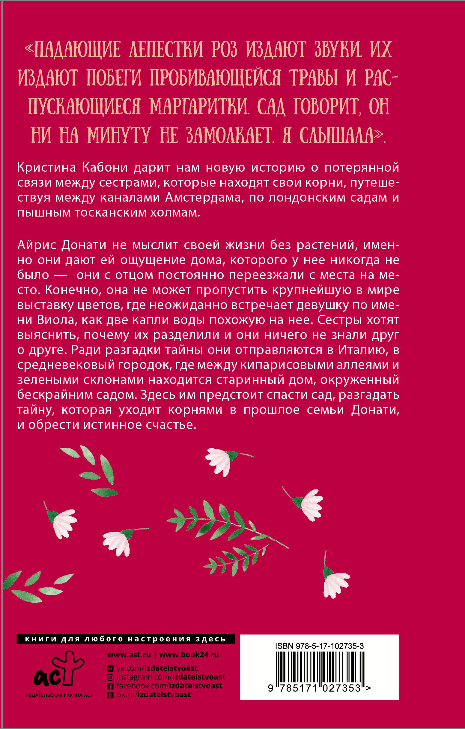Кристина Кабони дарит нам новую историю - о потерянной связи между сестрами, которые находят свои корни, путешествуя между каналами Амстердама, по лондонским садам и пышным тосканским холмам. Айрис Донати не мыслит своей жизни без растений, именно они дают ей ощущение дома, которого у нее никогда не было - они с отцом постоянно переезжали с места на место. Конечно, она не может пропустить крупнейшую в мире выставку цветов, где неожиданно встречает девушку по имени Виола, как две капли воды похожую на нее. Сестры хотят выяснить, почему их разделили и они ничего не знали друг о друге. Ради разгадки тайны они отправляются в Италию, в средневековый городок, где между кипарисовыми аллеями и зелеными склонами находится старинный дом, окруженный бескрайним садом. Здесь им предстоит спасти сад, разгадать тайну, которая уходит корнями в прошлое семьи Донати, и обрести истинное счастье.| Издательство | ИЗДАТЕЛЬСТВО "АСТ" |
