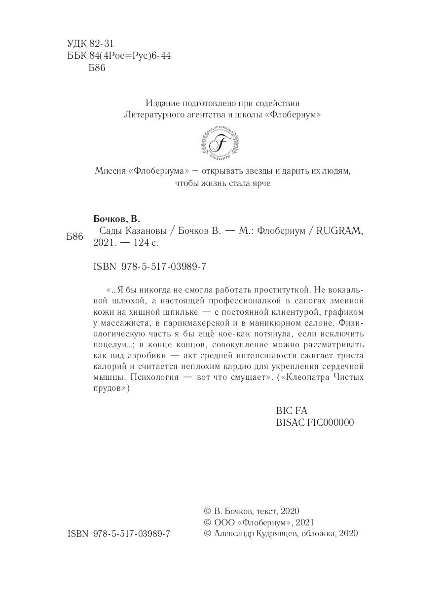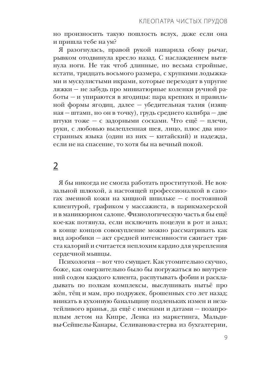 «…Я бы никогда не смогла работать проституткой. Не вокзальной шлюхой, а настоящей профессионалкой в сапогах змеиной кожи на хищной шпильке - с постоянной клиентурой, графиком у массажиста, в парикмахерской и в маникюрном салоне. Физиологическую часть я бы ещё кое-как потянула, если исключить поцелуи…; в конце концов, совокупление можно рассматривать как вид аэробики - акт средней интенсивности сжигает триста калорий и считается неплохим кардио для укрепления сердечной мышцы. Психология - вот что смущает». («Клеопатра Чистых прудов»)| Издательство | Т8 RUGRAM |