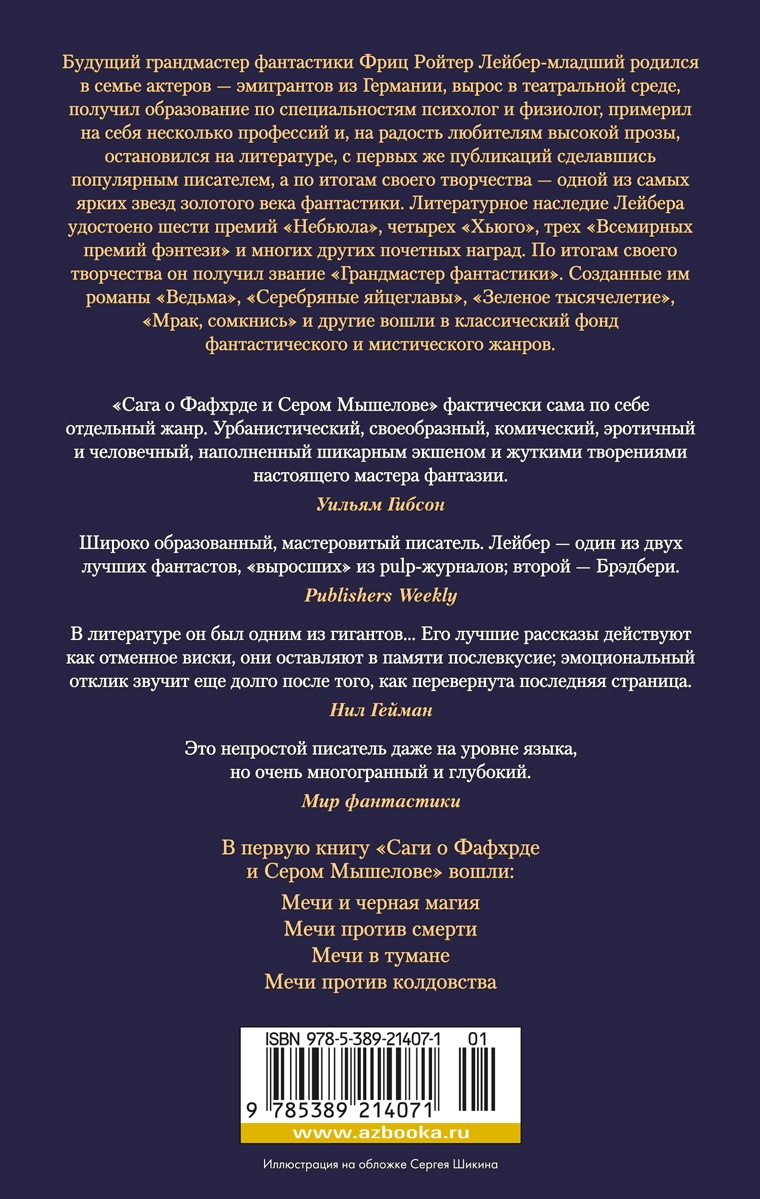 За многие десятилетия до «Ведьмака» и Джорджа Мартина вселенной меча и магии правил Фриц Лейбер. В эту книгу вошли четыре сборника произведений о приключениях любимых антигероев грандмастера - варвара-рубаки, умеющего недурно петь, и пронырливого воришки, владеющего приемами магии. Фэнтезийный дуэт, изначально задуманный автором в качестве тонкой пародии на говардовского Конана, быстро обрел собственную уникальную судьбу и столь же быстро прославился. В мрачном мире под названием Невон Фафхрд и Серый Мышелов без колебаний ввязываются в самые невероятные переделки, совершают чудеса выживания и никогда не теряют человечности и чувства юмора.| Издательство | Азбука |