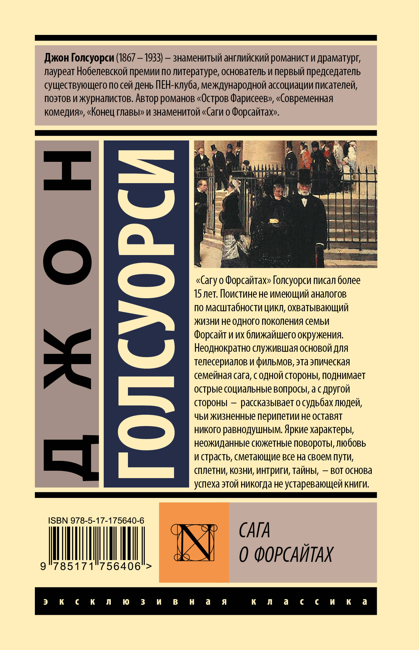 - Джон Голсуорси - выдающийся английский писатель первой половины XX века, автор книг «Остров фарисеев», «Современная комедия» и «Темный цветок», лауреат Нобелевской премии по литературе 1932 года. - «Сага о Форсайтах» - главное произведение автора, масштабная семейная сага, по своему размаху не имеющая аналогов. - «Сага о Форсайтах» нередко ложилась в основу фильмов и телесериалов. - Издание в серии «Эксклюзивная классика» - в узнаваемом оформлении и в твердой обложке.| Издательство | Издательство "АСТ" |