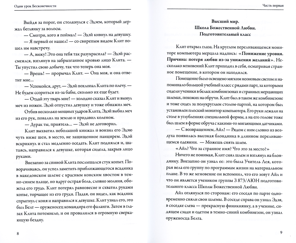 События книги переносят нас в школу Божественной Любви, где главные герои - Айл, Нэд и Юна - ученики подготовительного класса, урок за уроком проходят свой путь совершенствования. Но место их обучения - планета Земля, а задание - блестяще выполнить свое воплощение в различных телесных оболочках - от праведников и святых до убийц и воров. Погружая героев в новые и новые тела, автор показывает, насколько мы зависимы от земного мира, своих прихотей и страстей, и как мы можем справиться с ними. Рассказывая истории разных человеческих судеб, автор поразительным образом переплетает земной и небесный миры, скрытое и зримое, быль и вымысел. В одной книге вы найдете описания разных эпох и стран, исторических реалий и личностей, роман пронизан античными и библейскими образами, персонажами классической мировой и русской литературы. Динамичный сюжет, небольшие по объему главы и быстрое переключение из «земного» плана в «небесный» создают атмосферу интриги и делают текст, в котором зашифрованы новейшие сведения об устройстве Мироздания, увлекательным и легким.| Издательство | Амрита-Русь |