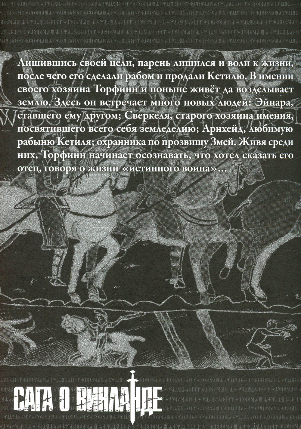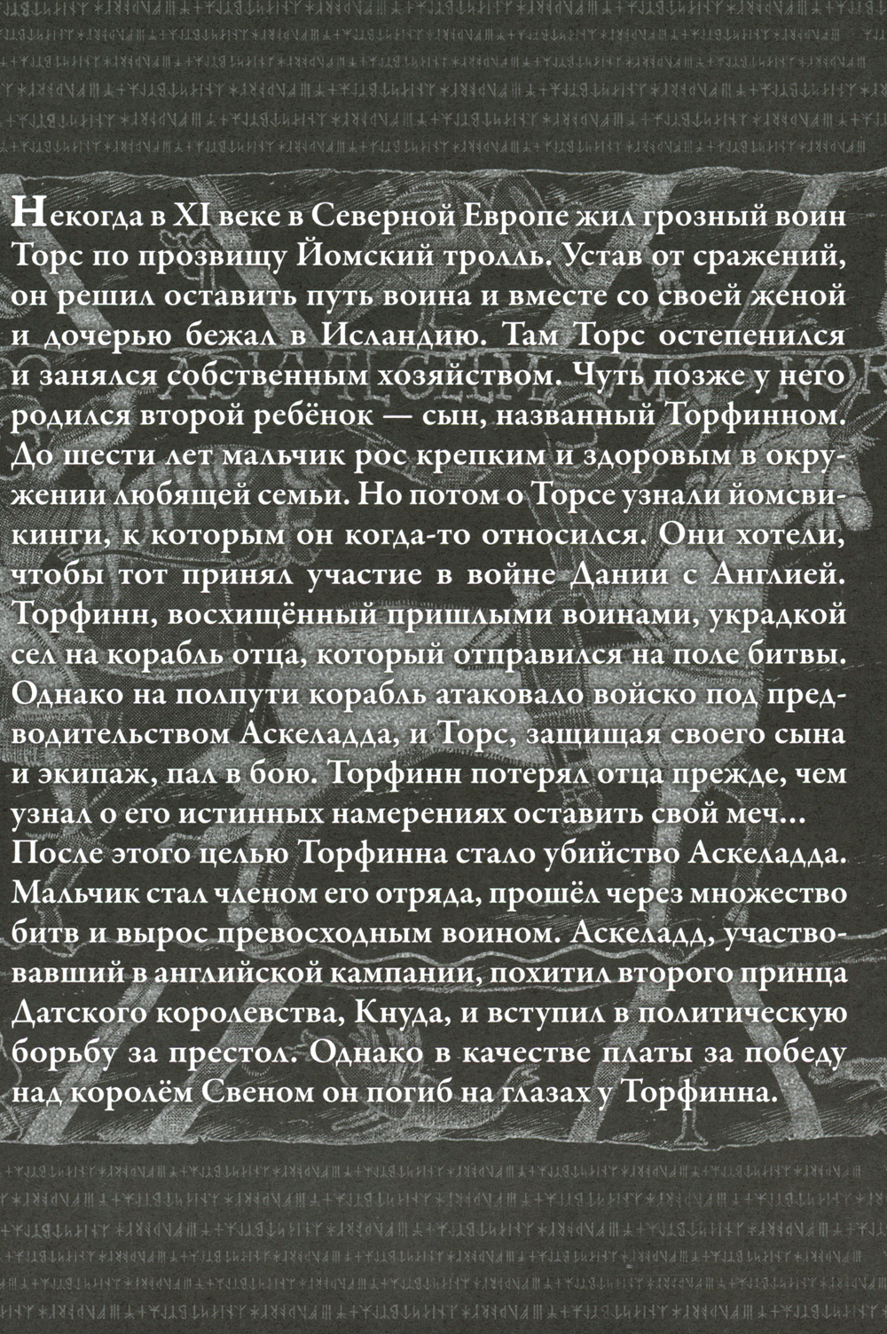 Некогда в XI веке в Северной Европе жил воинственный народ, звавшийся викингами. Но был среди них грозный воин, что устал от сражений, - Торс, «Йомский тролль». Он вместе с семьёй бежал в Исландию. Там у него родился сын, названный Торфинном. Но про- шлое нагнало Торса, и он погиб. Торфинн же был вынужден скитаться по полям сражений. Кнуд, ставший королём Англии, возвращается на родину, в Данию, чтобы почтить своего старшего брата Харальда. Тот уже давно безнадёжно болен и лежит прикованным к постели. Но для чего Кнуд вернулся домой, что замышляет и почему заинтересовался имением Кетиля? Судьба вновь невольно сталкивает лбами принца, ставшего королём, и воина, ставшего рабом…| Издательство | ИД Истари Комикс |