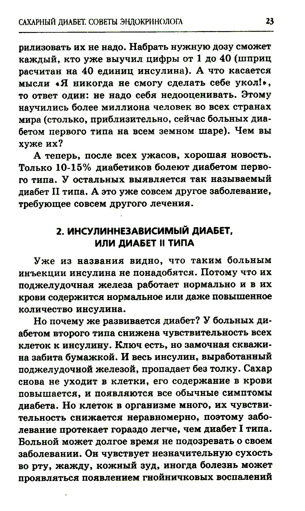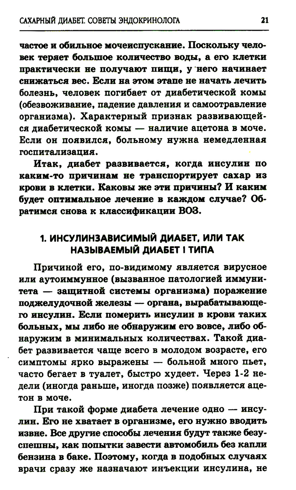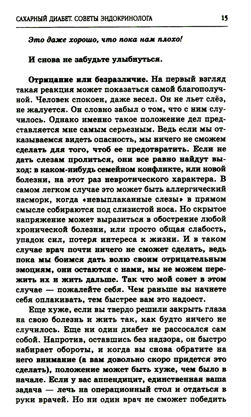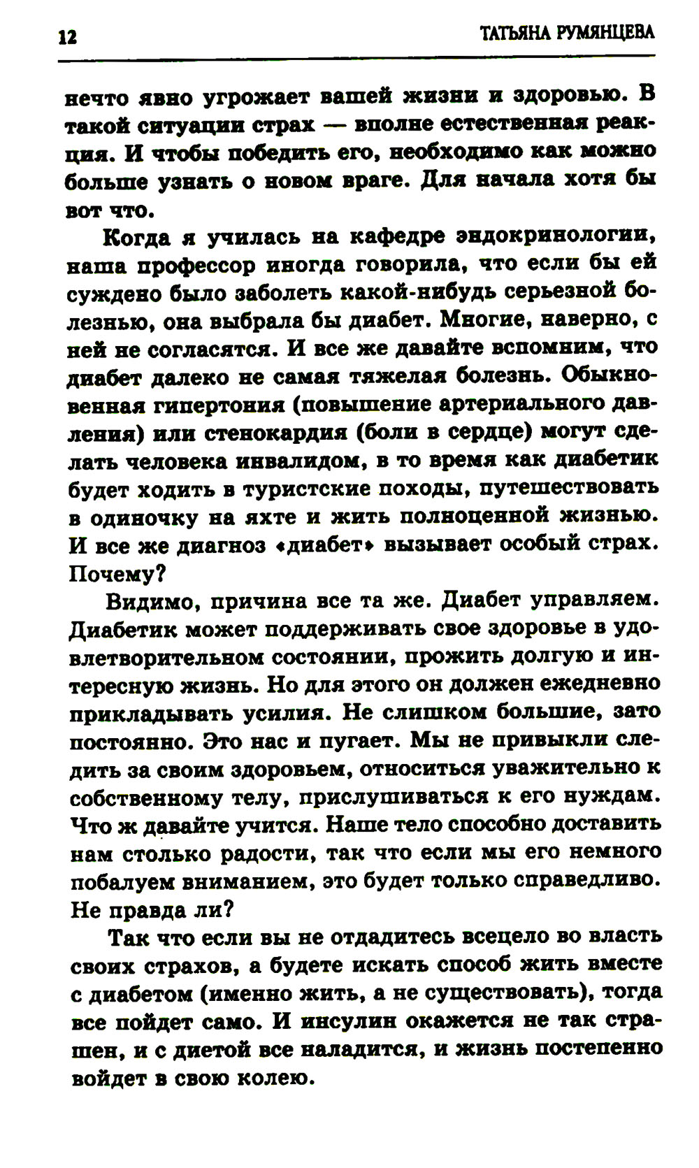 Диабет - не приговор. Диабет - это болезнь образа жизни. Изменив образ жизни, можно взять диабет под контроль и вести полноценную жизнь, а иногда - и полностью вылечиться. Эта книга - своего рода приём у врача-эндокринолога. На нём врач обстоятельно и не торопясь ответит вам на все самые важные и насущные вопросы, касающиеся диабета: О причинах заболевания, о видах диабета и разных подходах к их лечению. Об острых и хронических осложнениях, их лечении и профилактике. Возможна ли при диабете нормально протекающая беременность? Как решать психологические проблемы? Также мы поговорим о физкультуре при сахарном диабете, о диете и как разнообразить меню. Вы получите информацию о подсластителях. Не будут обойдены и другие важные для каждого больного вопросы: Какие документы необходимы диабетику? Как наладить отношения со своим лечащим врачом? С какими врачами кроме эндокринолога вам необходимо консультироваться? Какие анализы вам необходимы и как их правильно сдавать? А самое главное, что вы узнаете из книги - как, несмотря ни на что, не потерять качество жизни.
