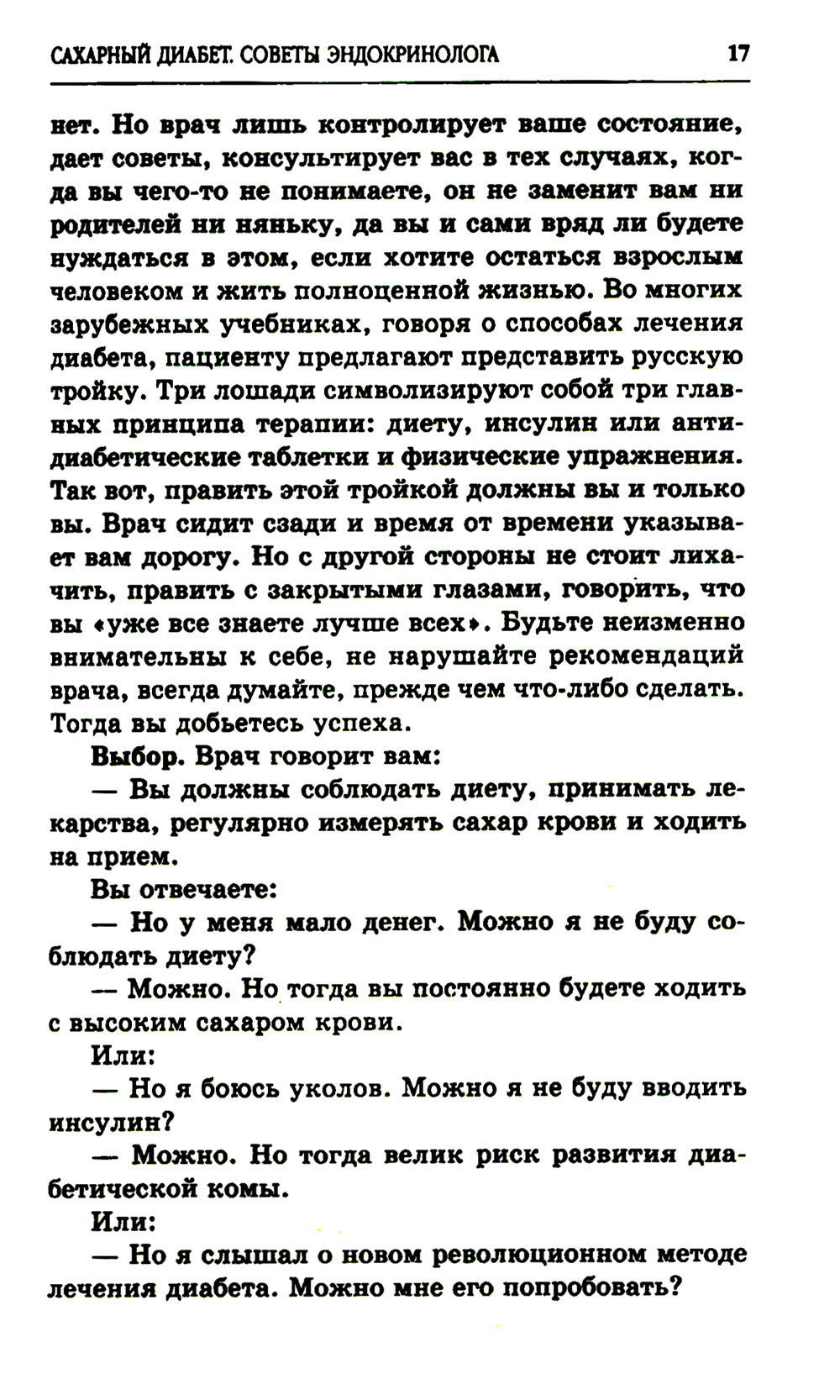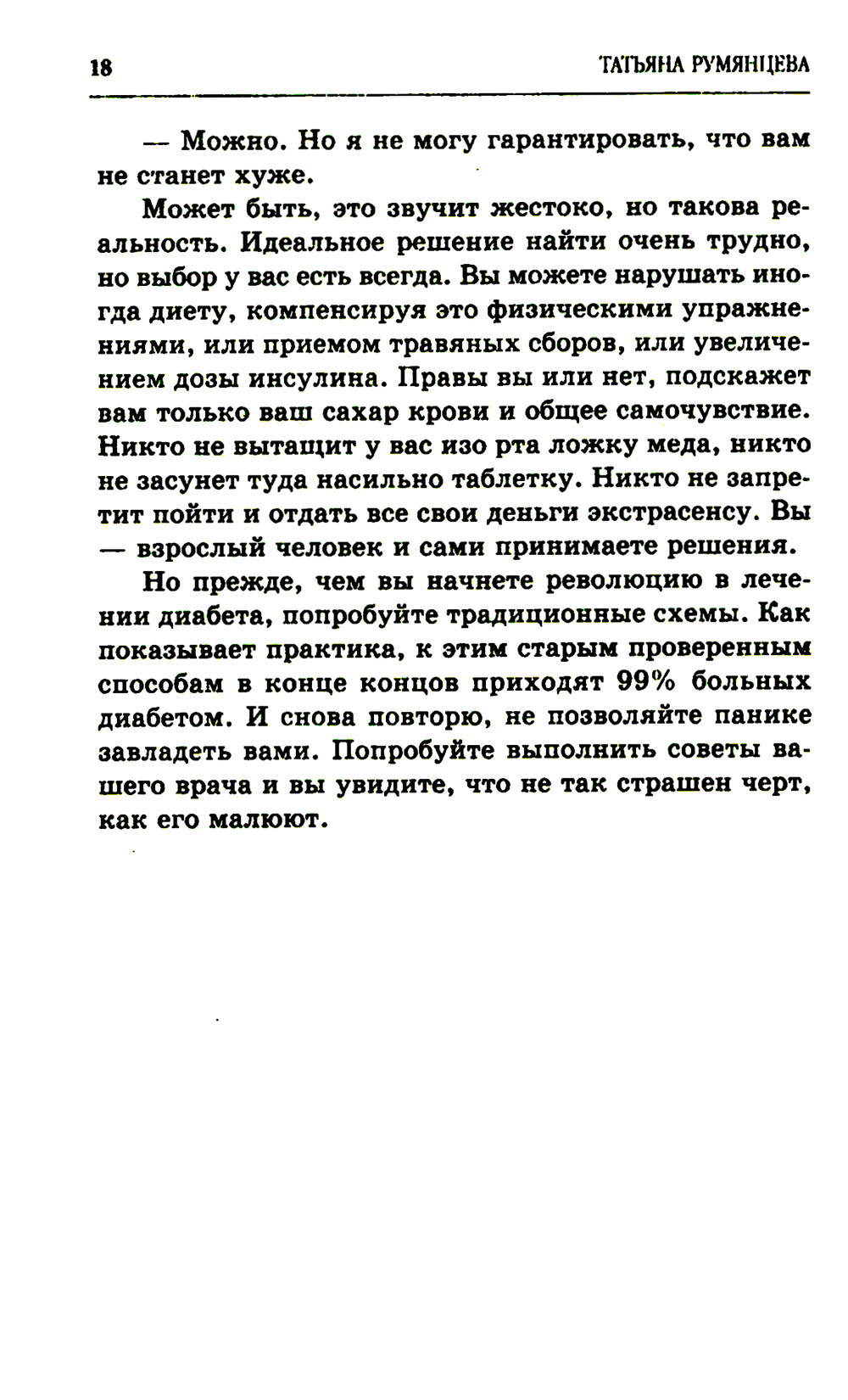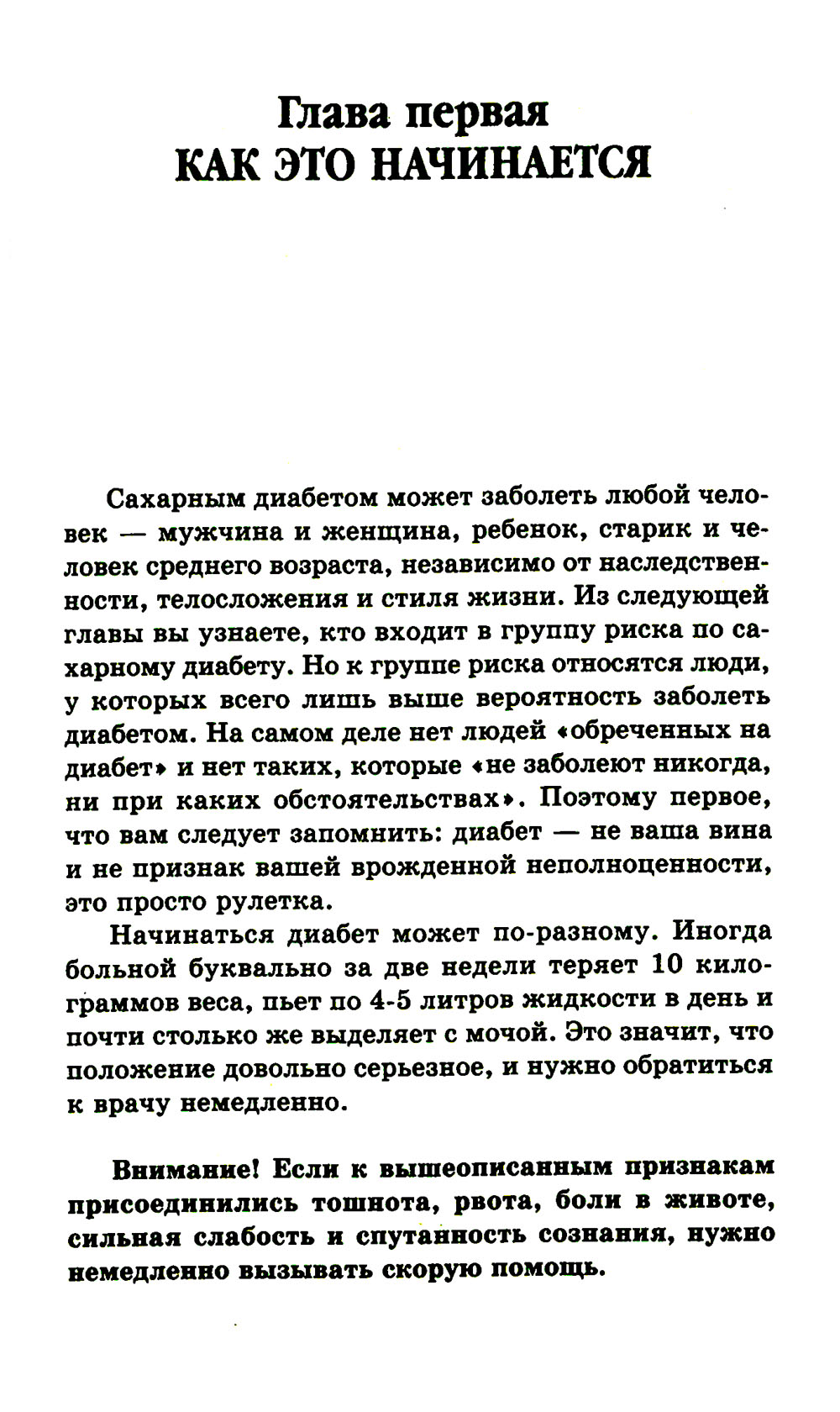 Диабет - не приговор. Диабет - это болезнь образа жизни. Изменив образ жизни, можно взять диабет под контроль и вести полноценную жизнь, а иногда - и полностью вылечиться. Эта книга - своего рода приём у врача-эндокринолога. На нём врач обстоятельно и не торопясь ответит вам на все самые важные и насущные вопросы, касающиеся диабета: О причинах заболевания, о видах диабета и разных подходах к их лечению. Об острых и хронических осложнениях, их лечении и профилактике. Возможна ли при диабете нормально протекающая беременность? Как решать психологические проблемы? Также мы поговорим о физкультуре при сахарном диабете, о диете и как разнообразить меню. Вы получите информацию о подсластителях. Не будут обойдены и другие важные для каждого больного вопросы: Какие документы необходимы диабетику? Как наладить отношения со своим лечащим врачом? С какими врачами кроме эндокринолога вам необходимо консультироваться? Какие анализы вам необходимы и как их правильно сдавать? А самое главное, что вы узнаете из книги - как, несмотря ни на что, не потерять качество жизни.
