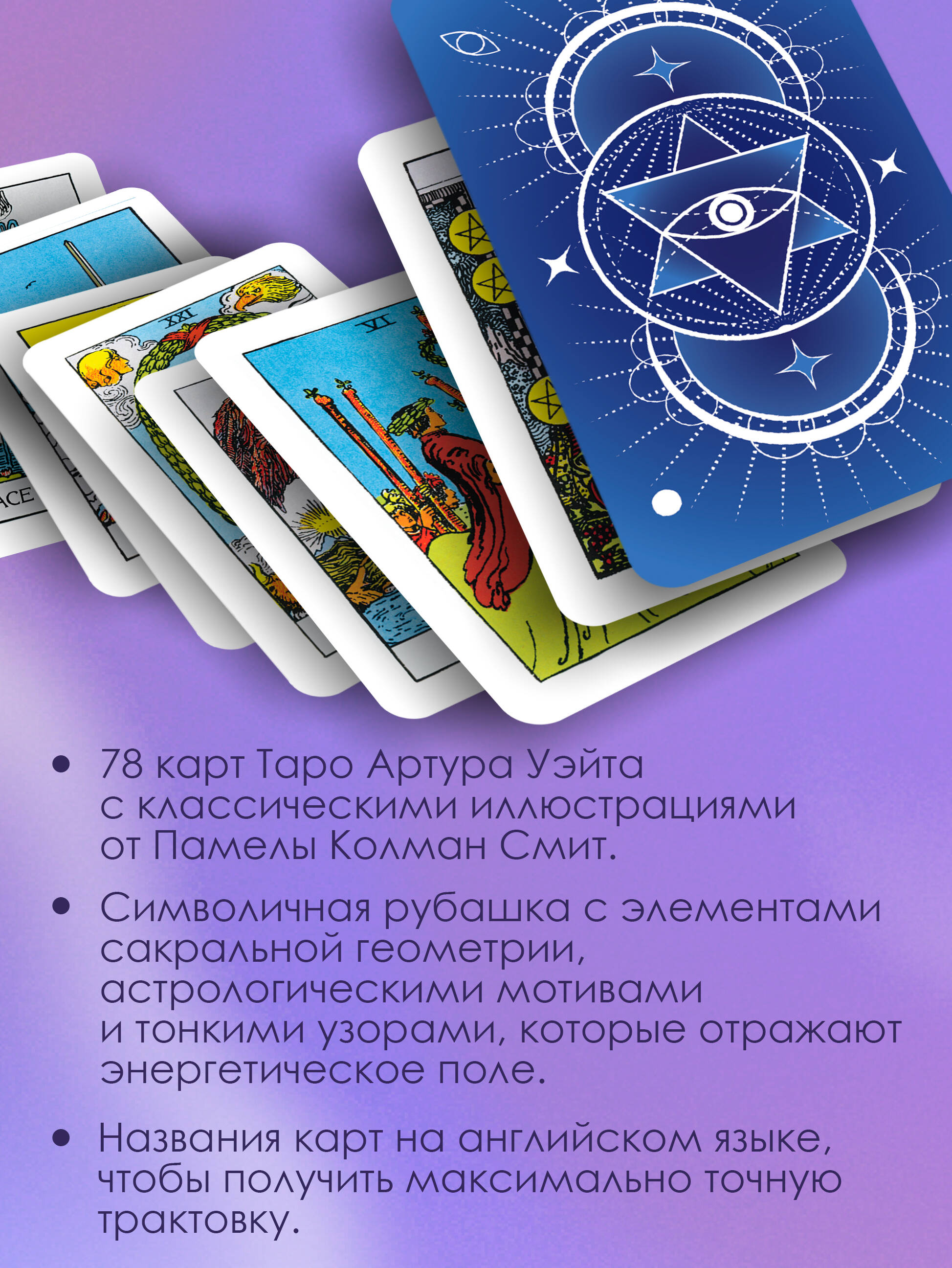 Карты Таро - это удивительный инструмент, ключ к информации, сокрытой от нас в невидимом мире. А Таро Уэйта - самая известная колода, ставшая эталоном. Ее автор - признанный мастер мистических учений Артур Уэйт, а иллюстрации выполнены Памелой Колман Смит. Главная особенность этого издания - уникальная магическая рубашка, наполненная символизмом и тайным смыслом. Яркий насыщенный синий цвет сразу настраивает на процесс гадания, привлекает нужную энергию и приносит эстетическое удовольствие. Вместе с ней ваш опыт гадания станет невероятно привлекательным и уникальным. На рубашке переплетаются элементы сакральной геометрии, астрологии и тонкие линии энергетических полей. Особый узор на обороте карт - не просто украшение: он работает как энергетический ключ, настраивая гадающего на работу с колодой. Симметрично расположенные геометрические символы активируют восприятие и усиливают интуитивный поток, помогая понять скрытые смыслы и послания колоды. Названия карт даны на английском языке, чтобы получить трактовку, максимально приближенную к тому, как ее задумывали авторы. Комплект состоит из 78 классических карт и руководства. Образы в колоде просты и понятны. Не только профессионалы, но новички сразу разберутся в значениях и символах.| Издательство | Издательство "АСТ" |