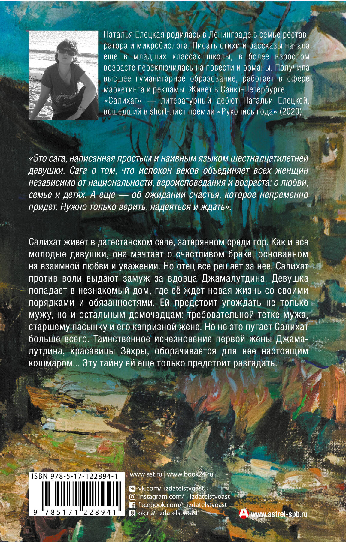 Роман Натальи Елецкой «Салихат», финалист премии «Рукопись года», повествует о нескольких годах жизни обычной дагестанской женщины. Салихат живет в глухом, затерянном среди гор дагестанском селе. Как и все юные девушки, она мечтает о браке по любви и основанном на взаимном уважении, но отец Салихат решает за неё: таковы традиции. Девушка попадает в дом вдовца Джамалутдина, старший сын которого почти ровесник Салихат. Ей предстоит привыкать к требовательности мужниной тётки и капризам жены старшего пасынка. Но больше всего Салихат не даёт покоя загадочное исчезновение первой жены Джамалутдина, красавицы Зехры…| Издательство | Издательство "АСТ" |