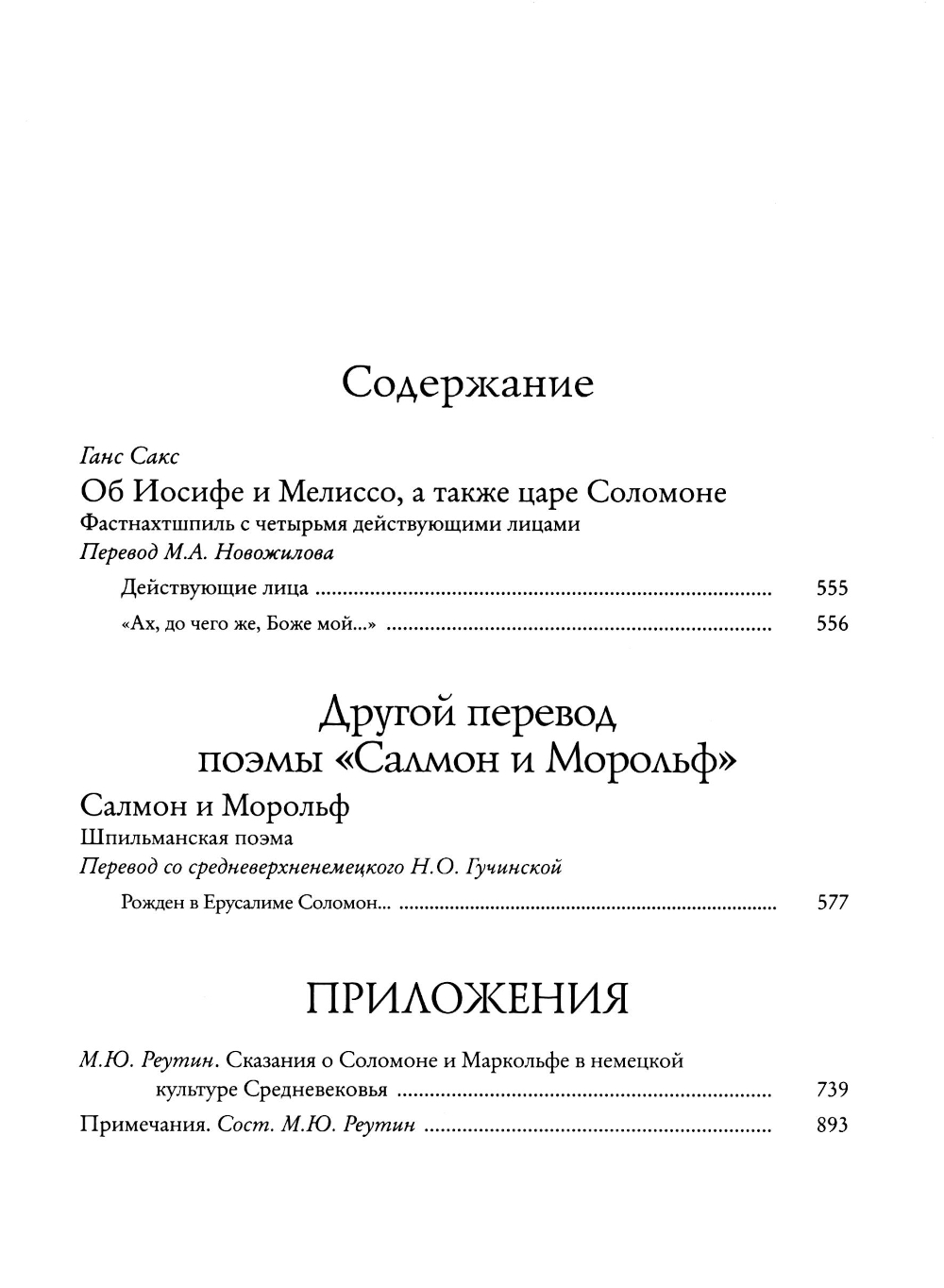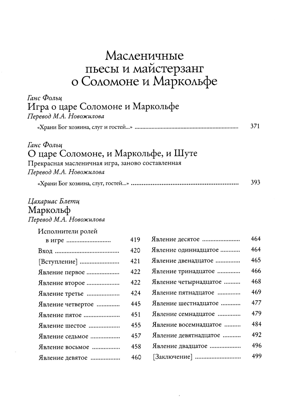 Старонемецкая смеховая культура - по-видимому, наиболее развитая среди комических традиций средневековой Европы - отечественному читателю уже отчасти известна. Благодаря классическим изданиям В. М. Жирмунского и Б. И. Пуришева главные ее персонажи (Тиль Уленшпигель, доктор Фауст, Шильдбюргеры и др.) прочно вошли в обиход российской гуманитарной науки и вызвали интерес широкого российского читателя. Меньше повезло более ранним комическим героям XIII-XV веков: шутам Попу Амису, Попу из Каленберга и демону-чернецу Брату Раушу, в свое время снискавшим популярность в пределах не только германской, но и всей европейской культуры. Самым старым среди них является шут Маркольф, известный также под именем Морольф. Маркольфом - уродом с демоническими и зооморфными чертами, но неординарным интеллектом и такой же предприимчивостью - европейская наука заинтересовалась в конце XVIII века. Примерно столетие спустя этому литературному персонажу и его «конкуренту» Соломону посвятил докторскую диссертацию А. Н. Веселовский. В настоящий том входят полные переводы всех произведений немецкой маркольфианы - самой развитой из национальных Маркольфических традиций средневековой Европы. К этим произведениям относятся шпильманский эпос конца XII века «Салмон и Морольф» (в терминологии Веселовского - «Маркольф I»); латинский комический «Диалог Соломона и Маркольфа» («Маркольф II»), созданный в часы рекреации, вероятно, кем-нибудь из клириков-вагантов в стенах соборной или монастырской школы в первые десятилетия XIII века; три немецкоязычных перевода-переложения «Диалога» XIV и XV веков и пять масленичных пьес (фастнахтшпилей) XV и XVI веков, написанных нюрнбергскими майстерзингерами Г. Фольцем, Г. Саксом и люцернским драматургом Ц. Блетцем. Переводы снабжены подробными примечаниями и сопроводительной статьей. В последней немецкие произведения о Маркольфе рассмотрены в широком культурно-историческом контексте, на фоне Соломоновой традиции, возникшей из позднеантичной библейской экзегезы (Вавилонский Талмуд, Мидраш), распространившейся в арабской, русской, древнеанглийской культурах и в свою очередь породившей на рубеже 1-го и 2-го тысячелетий дочернюю Маркольфическую традицию, проникшую к середине XVI века во французскую, английскую, итальянскую, польскую, датскую, шведскую и исландскую культуры. В процессе становления двух традиций возник ряд реинкарнаций демонического оппонента иерусалимского царя Соломона: Асмодей/Ашмедай, Захр, Абдим/Абдемон, Китоврас, Сатурн и, наконец, Маркольф/Морольф (Маркюль, Мелькольв, Бертольдо). Связанные большим количеством мотивов и образов, разнесенных на протяжении многих столетий по обширным территориям Восточного Средиземноморья, Ближнего Востока, Восточной, Центральной, Западной Европы (от Кижского погоста до Рейна) Соломонова и Маркольфическая традиции содержат в себе материал, подлежащий изучению в рамках сравнительного литературоведения, чем, собственно, занимался А. Н. Веселовский, увлеченный идеями Т. Бенфея. При том что данный материал в полной мере учитывается, научный интерес в настоящем издании смещен, тем не менее, с эпического к комическому Маркольфу («Маркольф II»). Имея в своем строении пространный агон и повествовательные анекдоты-шванки, латинский «Диалог Соломона и Маркольфа» и его многочисленные п