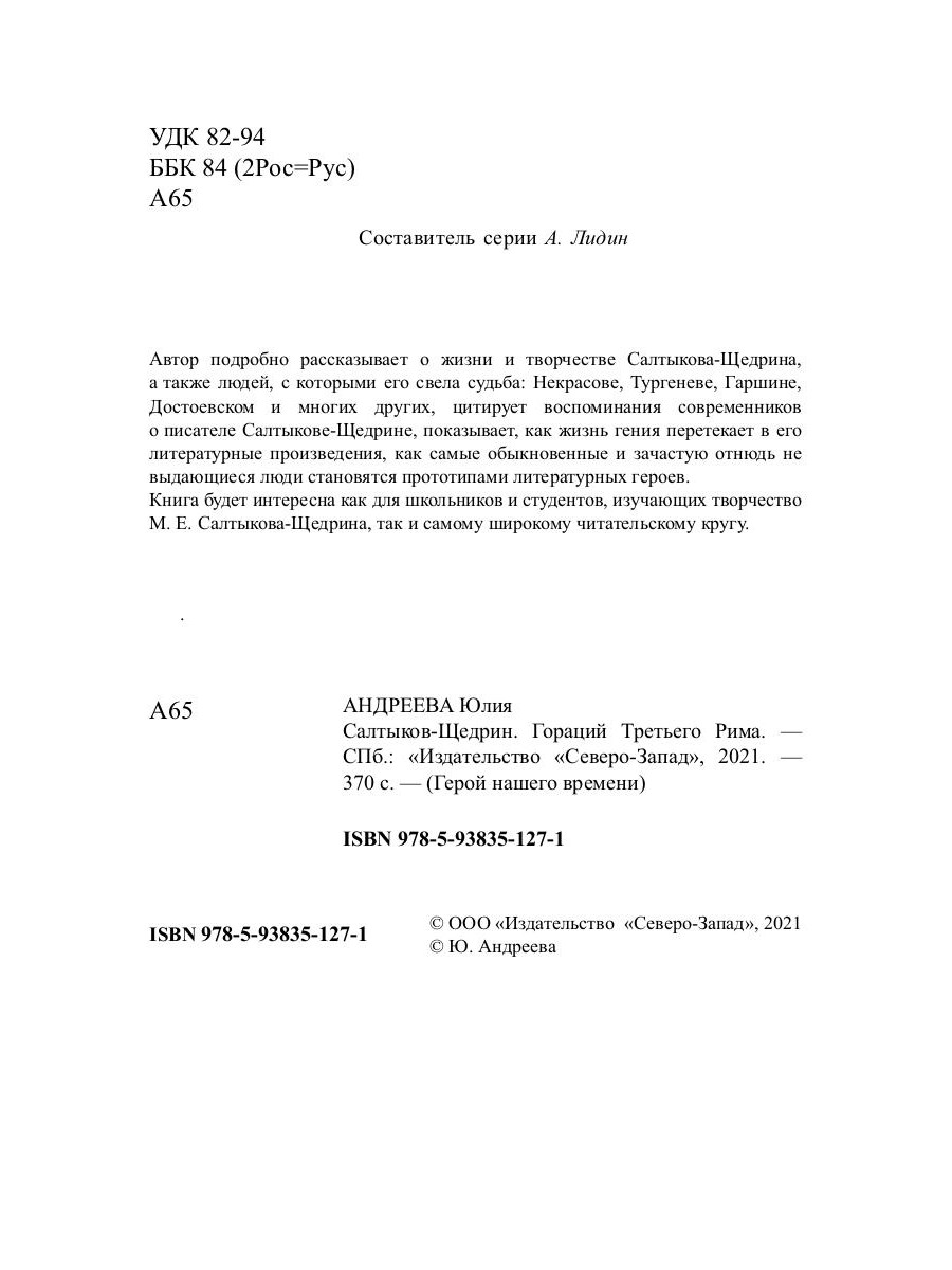 Автор подробно рассказывает о жизни и творчестве Салтыкова-Щедрина, а также людей, с которыми его свела судьба: Некрасове, Тургеневе, Гаршине, Достоевском и многих других, цитирует воспоминания современников о писателе Салтыкове-Щедрине, показывает, как жизнь гения перетекает в его литературные произведения, как самые обыкновенные и зачастую отнюдь не выдающиеся люди становятся прототипами литературных героев. Книга будет интересна как для школьников и студентов, изучающих творчество М. Е. Салтыкова-Щедрина, так и самому широкому читательскому кругу.| Издательство | Т8 RUGRAM |