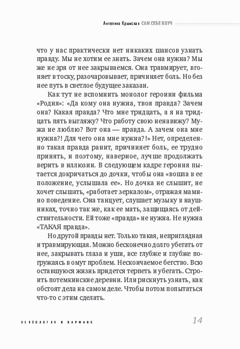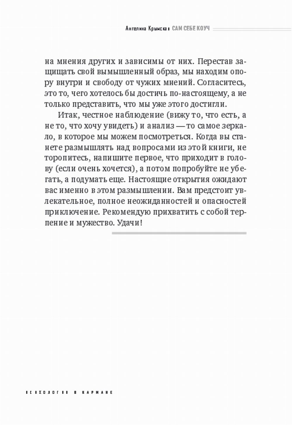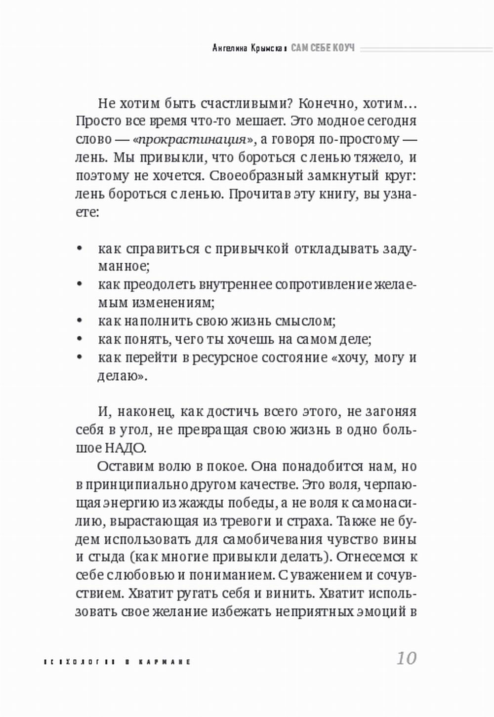 Зачем я живу? В чем моё предназначение? Есть ли у меня потенциал, который я не использую? Как мне его реализовать? Если вы ищите ответы на эти вопросы, книга Ангелины Крымской «Сам себе коуч или как найти свое предназначение за 14 дней» - для вас. Это практическое руководство по выходу из кризиса бесконечного поиска. Вы узнаете, как принять свои особенности, разглядеть таланты и начать действовать таким образом, чтобы максимально полно реализовать сокрытые сокровища. В данной книге автором собраны лучшие психологические техники, которые помогут вам: - узнать свои истинные желания; - справиться с привычкой откладывать задуманное; - преодолеть страх неудачи; - наполнить свою жизнь смыслом; - перейти в ресурсное состояние «хочу, могу и делаю». И наконец, достичь все это, не загоняя себя в угол, не превращая свою жизнь в одно большое НАДО.| Издательство | Городец |