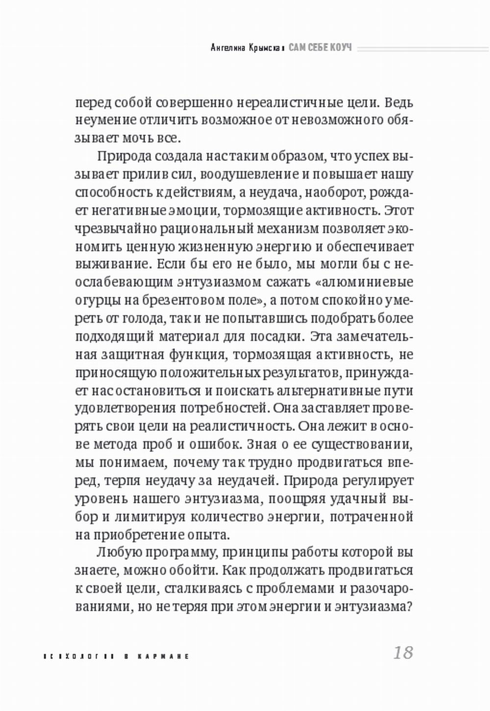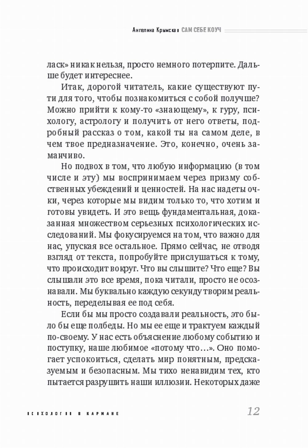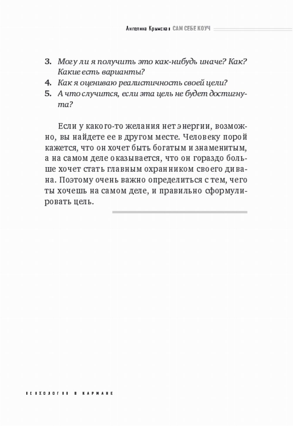 Зачем я живу? В чем моё предназначение? Есть ли у меня потенциал, который я не использую? Как мне его реализовать? Если вы ищите ответы на эти вопросы, книга Ангелины Крымской «Сам себе коуч или как найти свое предназначение за 14 дней» - для вас. Это практическое руководство по выходу из кризиса бесконечного поиска. Вы узнаете, как принять свои особенности, разглядеть таланты и начать действовать таким образом, чтобы максимально полно реализовать сокрытые сокровища. В данной книге автором собраны лучшие психологические техники, которые помогут вам: - узнать свои истинные желания; - справиться с привычкой откладывать задуманное; - преодолеть страх неудачи; - наполнить свою жизнь смыслом; - перейти в ресурсное состояние «хочу, могу и делаю». И наконец, достичь все это, не загоняя себя в угол, не превращая свою жизнь в одно большое НАДО.| Издательство | Городец |
