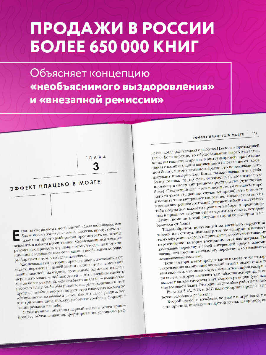 Феноменальное научное открытие. Мировой бестселлер. Продано 3 000 000 экземпляров. Научное объяснение эффекта плацебо. Исследования и эксперименты с поразительными результатами. Новая техника медитаций. Программирование подсознательного. О книге Наше тело поддерживает нас. Оно создает почти 100 триллионов специализированных клеток - начав всего с двух, заставляет сердце сокращаться, проводит сотни тысяч химических реакций в каждой клетке каждую секунду. Обновление встроено в самую ткань нашего тела, а его ослабление и болезнь - это исключение, а не правило. Почему люди выздоравливают, принимая пустую пилюлю или получая инъекцию обычного физраствора? Джо Диспенза объясняет, как работает плацебо с точки зрения науки, и доказывает, что у тела есть способность к самоисцелению. Джо Диспенза стал первым, кто начал исследовать влияние сознания на реальность с научной точки зрения. Свое исследование Джо Диспенза начал после трагического случая - его сбила машина, и у него оказались сломаны шесть позвонков. Врачи предлагали скрепить позвонки с помощью имплантов, но последствия операции были непредсказуемы - врачи не знали, сможет ли пациент снова ходить. Доктор Джо Диспенза отказался от операции и решил восстановить сломанный позвоночник с помощью силы мысли и медитации. Всего через 9 недель терапии Диспенза снова мог ходить. Это и послужило толчком к исследованию возможностей человеческого сознания. Об авторе Доктор Диспенза - профессор нейрохимии и нейробиологии, руководитель клиники интегрированной медицины. Автор мировых бестселлеров по развитию мозга. Джо Диспенза выступает с мастер-классами в 26 странах на 5 континентах. Он обучил тысячи людей, как перенастроить свой мозг и тело, чтобы улучшить здоровье и жизнь. Диспенза - первый автор, которому удалось понятно, доступно и на научном языке объяснить работу подсознания. Отзывы «Книга просто великолепна! Возможно, это единственный рецепт, который вам когда-нибудь потребуется». - Дон Мигель Руис, доктор медицины, автор бестселлера «Четыре соглашения. Руководство по достижению личной свободы» «Обожаю способность доктора Диспензы излагать сложные идеи так, что любой из нас сможет не только понять их, но и извлечь для себя пользу». - Дэниел Дж. Амен, доктор медицины, основатель Клиники Амена и автор бестселлера «Измени свой мозг - изменится и жизнь!»| Издательство | ООО "Издательство "Эксмо" |