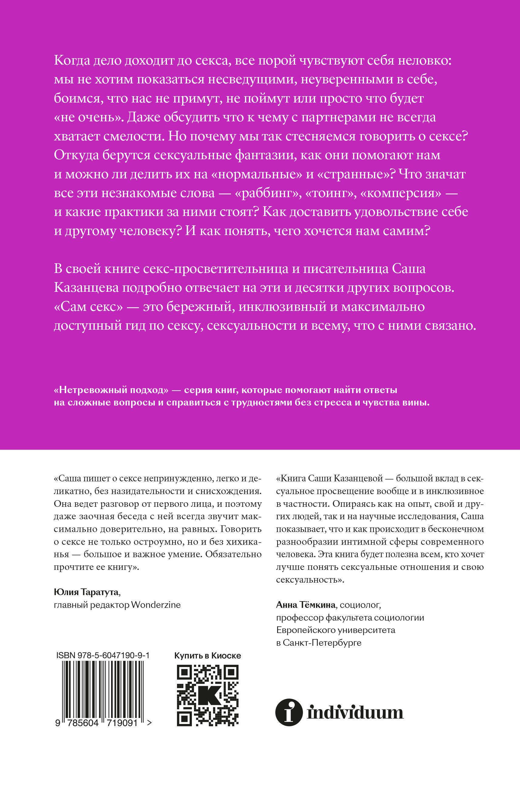 Когда дело доходит до секса, все порой чувствуют себя неловко: мы не хотим показаться несведущими, неуверенными в себе, боимся, что нас не примут, не поймут или просто что будет «не очень». Даже обсудить что к чему с партнерами не всегда хватает смелости. Но почему мы так стесняемся говорить о сексе? Откуда берутся сексуальные фантазии, как они помогают нам и можно ли делить их на «нормальные» и «странные»? Что значат все эти незнакомые слова - «раббинг», «тоинг», «комперсия» и какие практики за ними стоят? Как доставить удовольствие себе и другому человеку? И как понять, чего хочется нам самим? В своей книге секс-просветительница и писательница Саша Казанцева подробно отвечает на эти и десятки других вопросов. «Сам секс» - это бережный, инклюзивный и максимально доступный гид по сексу, сексуальности и всему, что с ними связано.