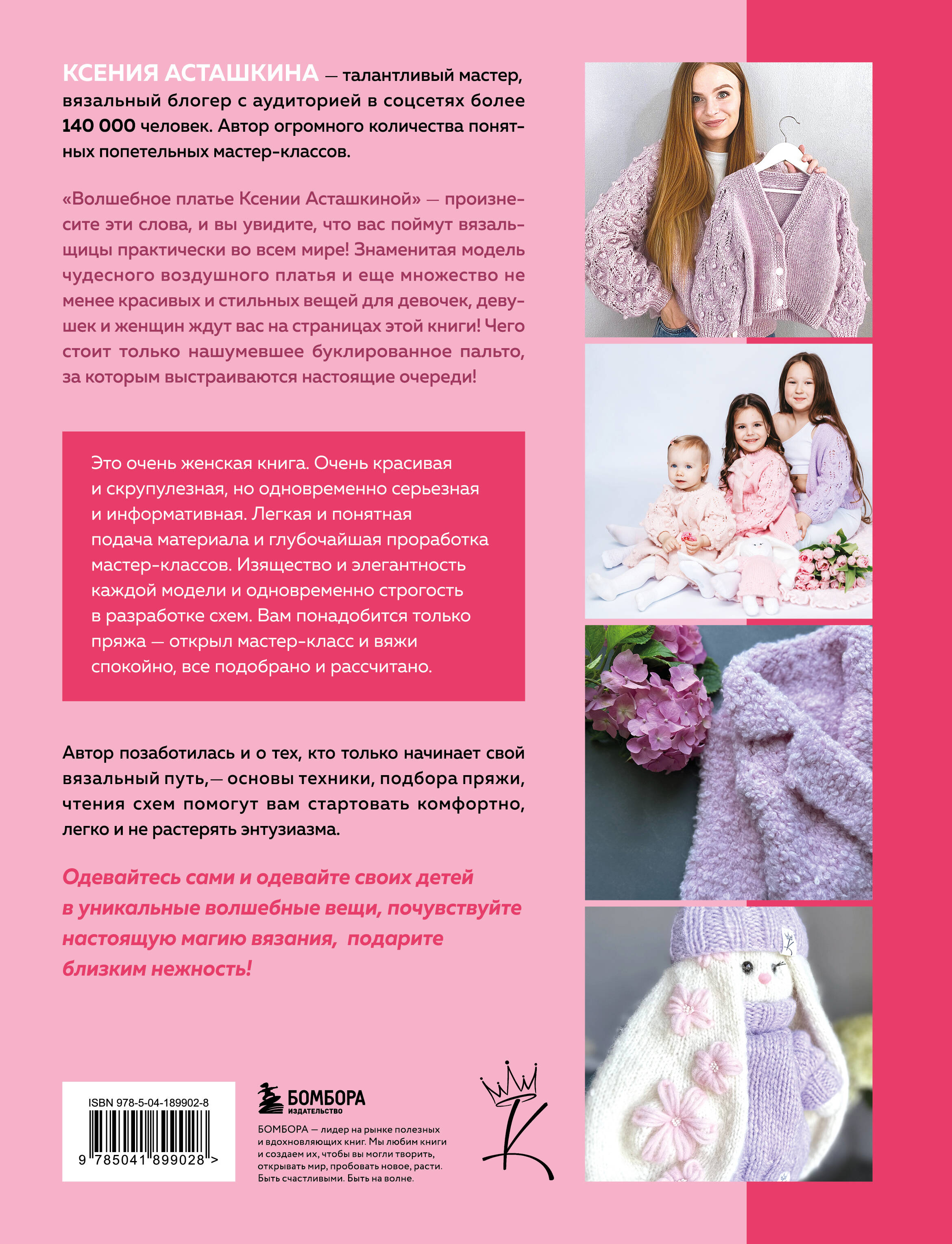 «Окутываю волшебством вязания, мотивирую и учу! Верьте в себя! Делайте то что, заставляет вас быть счастливыми! И все обязательно получится!» - Ксения Асташкина «Волшебное платье Ксении Асташкиной» - произнесите эти слова, и вы увидите, что вас поймут вязальщицы практически во всем мире! Знаменитая модель чудесного воздушного платья и еще множество не менее красивых и стильных вещей для девочек, девушек и женщин уже оценили тысячи и тысячи вязальщиц из разных стран. И теперь они ждут вас на страницах этой книги! Чего стоит только нашумевшее буклированное пальто, за которым выстраиваются настоящие очереди! Придумывать и вязать такую нежность умеет только Ксения Асташкина. А еще она умеет создавать такие мастер-классы, по которому свяжет роскошную вещь абсолютно любой - все тщательно продумано, подобрано, рассчитано, расписано по шагам и прекрасно проиллюстрировано. Просто выбирай модель и вяжи! Об авторе: Ксения Асташкина - талантливый мастер, вязальный блогер с аудиторией в соцсетях более 140 000 человек. Автор огромного количества понятных попетельных мастер-классов. Больше всего любит вязать детские вещи и стильную одежду для мам и детей.| Издательство | ООО "Издательство "Эксмо" |