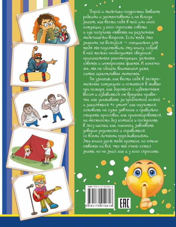 Ты узнаешь, как ориентироваться на местности без компаса и построить в лесу шалаш, как вести себя в экстремальных ситуациях и остаться в живых при пожаре, как бороться с избыточным весом и избавиться от вредных привычек, как ухаживать за проблемной кожей и закаляться «с умом», как научиться готовить не хуже девчонок и правильно стирать кроссовки, как завоевать доверие родителей и справиться со всеми внутренними переживаниями. Эта книга даст тебе краткие, но емкие ответы на всё, что ты очень хотел знать, но не знал, как и у кого спросить.