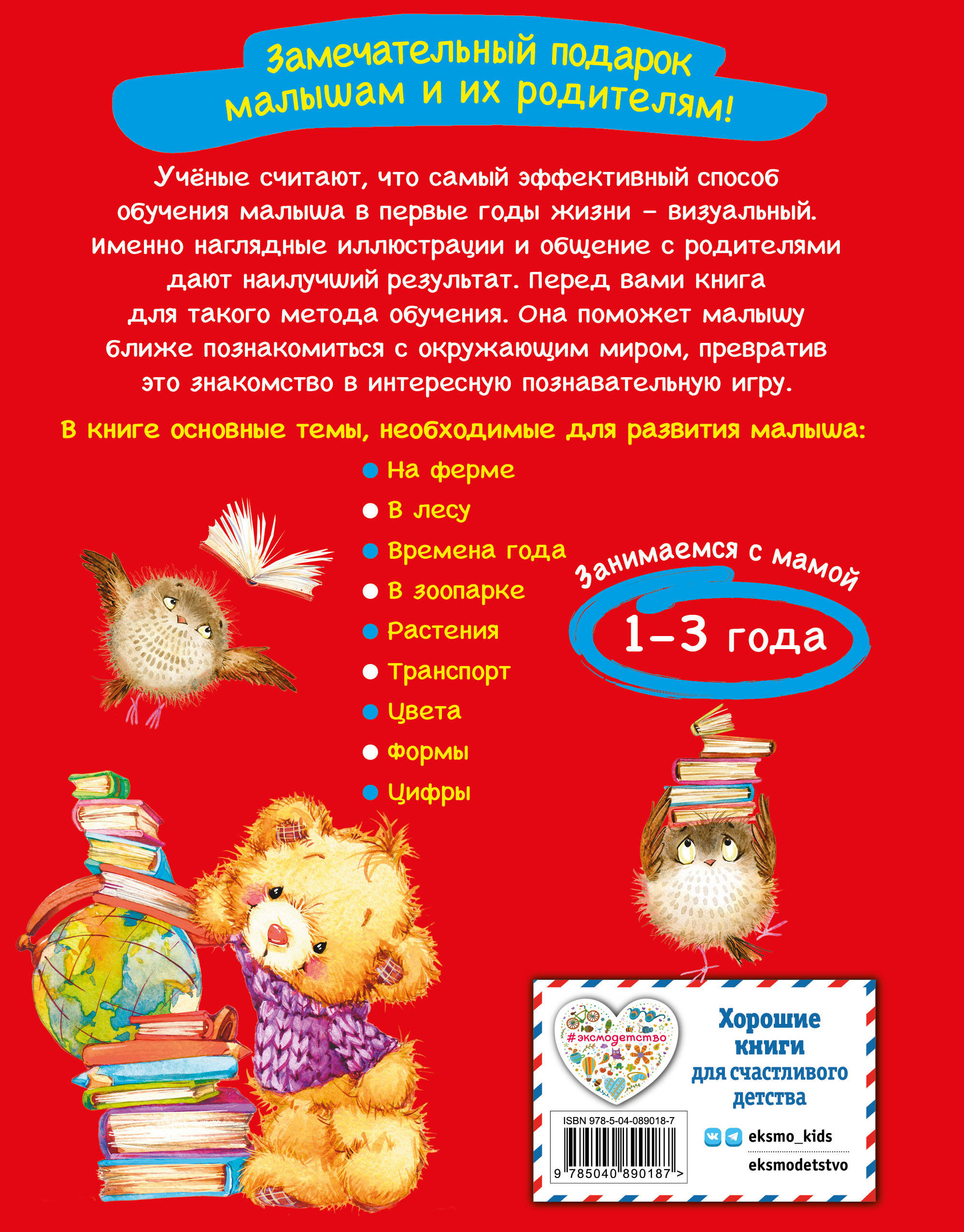 Ученые считают, что самый эффективный способ обучения малыша в первые годы жизни - визуальный. Именно наглядные иллюстрации и общение с родителями дают наилучший результат. Эта книга для такого метода обучения. Она поможет малышу ближе познакомиться с окружающим миром, превратив это знакомство в интересную познавательную игру. Она станет важным элементом интеллектуального и эмоционального развития ребенка. Перелистывая страницы книги, он узнает много нового и интересного о домашних и диких животных, растениях, временах года и видах транспорта, научится узнавать и называть цвета, формы и цифры, сможет потренировать внимание и зрительное восприятие, развить память, мышление, воображение, расширить кругозор и словарный запас. Книга будет отличным подарком и принесет много положительных эмоций любознательным непоседам.| Издательство | ООО "Издательство "Эксмо" |