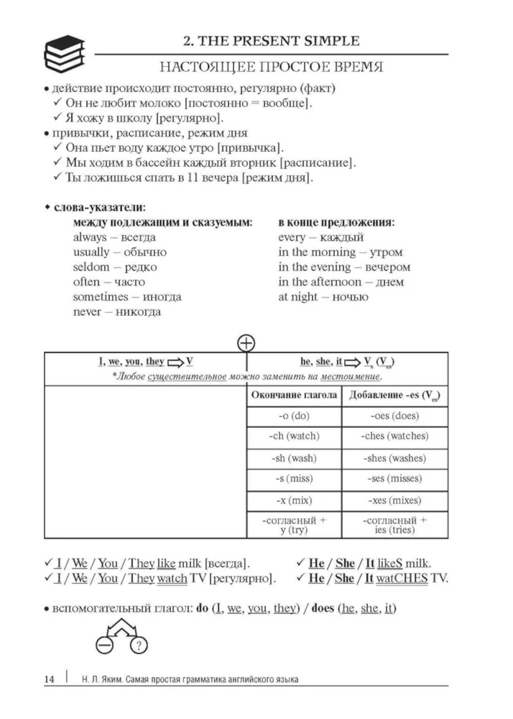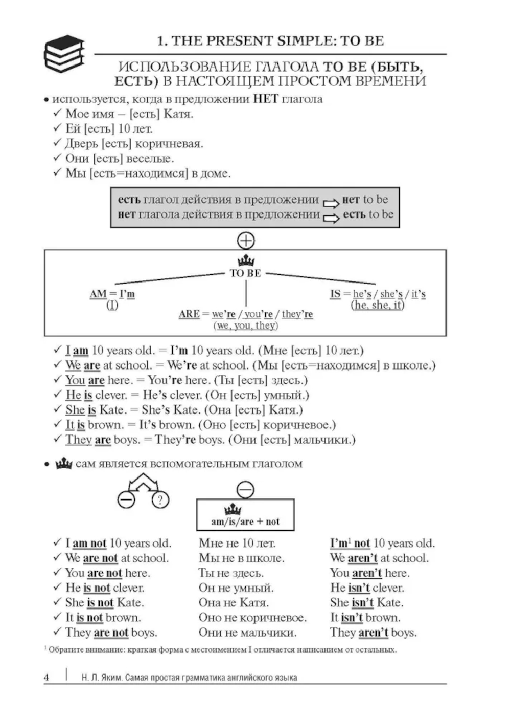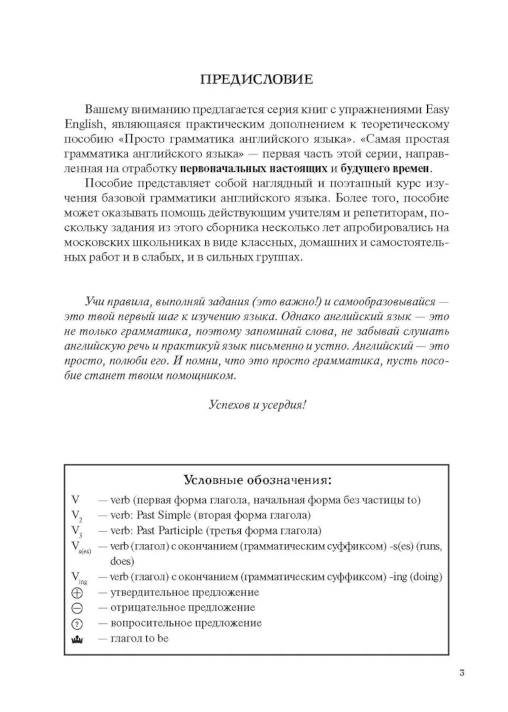 Книга является первой частью серии практических пособий Easy English, дополняющей теоретическое пособие «Просто грамматика английского языка». Она предназначена для отработки первоначальных настоящих и будущего времен. Поэтапное освоение тем поможет запомнить и систематизировать материал. Пособие станет полезным дополнением к любому учебнику. Оно поможет понять новый, а также повторить и осознать ранее изученный материал, ведь в нем сначала в наглядной форме представлено правило, затем дано объяснение применения, а после идет отработка правила на базе множества упражнений. Сборник упражнений может использоваться как для самостоятельного изучения языка, так и в качестве дополнительного материала в помощь учителю или репетитору.| Издательство | Проспект |