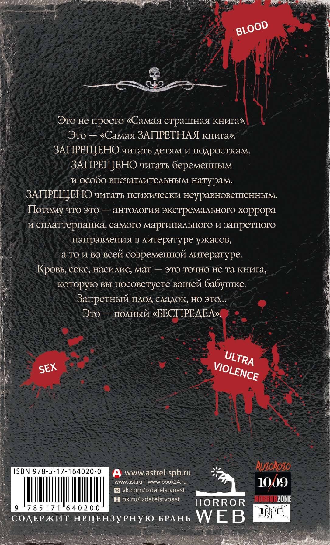 Это не просто "Самая страшная книга". Это - "Самая ЗАПРЕТНАЯ книга". ЗАПРЕЩЕНО читать детям и подросткам. ЗАПРЕЩЕНО читать беременным и особо впечатлительным натурам. ЗАПРЕЩЕНО читать психически неуравновешенным. Потому что это - антология экстремального хоррора и сплаттерпанка, самого маргинального и запретного направления в литературе ужасов, а то и во всей современной литературе. Кровь, секс, насилие, мат - это точно не та книга, которую вы посоветуете вашей бабушке. Запретный плод сладок, но это… Это - полный "БЕСПРЕДЕЛ".| Издательство | Издательство "АСТ" |
