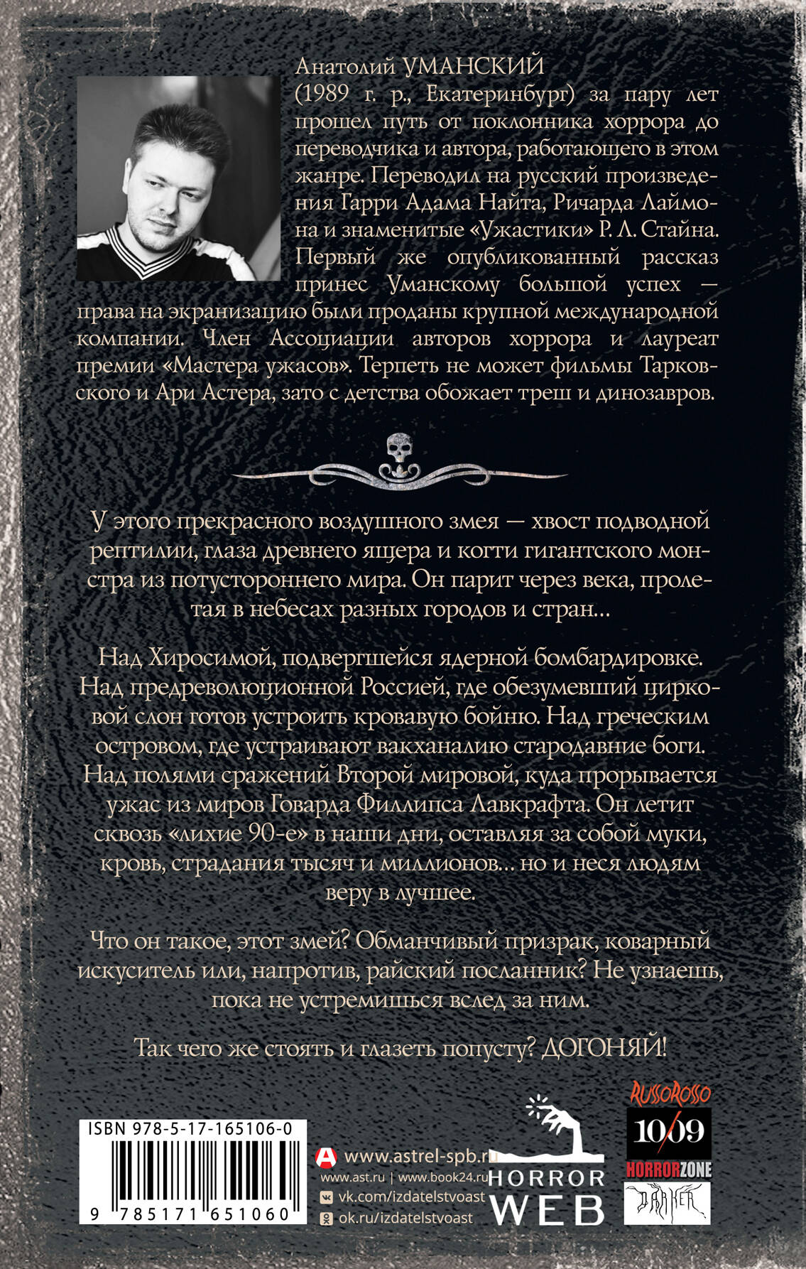 Новинка в серии «Самая страшная книга». Для всех поклонников жанра хоррор. Для тех, кто уже прочитал «Колумбарий» и «Из бездны». Анатолий Уманский - известный автор, переводчик и поклонник жанра, член Ассоциации авторов хоррора, постоянный участник проекта «Самая страшная книга» и лауреат премии «Мастера ужасов». «Догоняй!» - первый авторский сборник Анатолия Уманского, в книгу вошли самые лучшие повести и рассказы, написанные за последние несколько лет. Из этих историй вы узнаете об обезумевшем слоне, готовом устроить бойню в царской России, о греческом острове, на котором устраивают вакханалию древние боги, и о полях сражений Второй Мировой, на которые прорываются ужасы из миров Говарда Филлипса Лавкрафта.